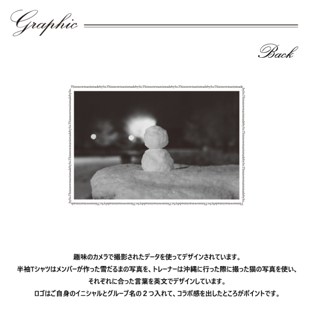 | 商品Data | 笠谷朗さんとのコラボ企画! 今回のコラボは半袖Tシャツ、トレーナー、ブレスレットをリリース。 【デザイン】 趣味のカメラで撮影されたデータを使ってデザインされています。 半袖Tシャツはメンバーが作った雪だるまの写真を、 トレーナーは沖縄に行った際に撮った猫の写真を使い、 それぞれに合った言葉を英文でデザインしています。 ロゴはご自身のイニシャルとグループ名の2つ入れて、コラボ感を出したところがポイントです。 ここでしか手に入らない受注期間限定アイテムです!是非お買い求めください!!! ※商品の発送予定時期は 【12月中旬頃〜12月下旬頃順次発送予定】 となります。 ※受注生産の為、発送予定時期が前後する場合がございます。 ※高額注文の場合には ご注文後にお電話にてご連絡をさせていただく場合がございます。 お電話にてご連絡が取れない場合にはメールにてご連絡させていただき、 ご連絡日より3日以内にご返信をいただけない場合には不正注文の可能性があると判断し トラブル防止のためご注文をキャンセルとさせていただきます。 ※商品によっては撮影時にサンプルを使用しているため若干仕様が異なる場合がございます。 また、サイズ・カラーによっては仕様が異なる場合もございます。 ※手作業で縫製をしているため縫製の仕様により、 個体差が生じてしまいますので、1~2cm程度の誤差は予めご了承くださいませ。 ※洗濯機を使用した場合、お届け時のサイズより多少縮む場合がございます。 洗濯機を使用する場合は裏返してネットに入れることを推奨しております。 また、タンブラー乾燥機を使用しますとプリントが剥がれる恐れがありますので 避けていただきますようお願いいたします。 また、洗濯時の液温は40度以下とし、 塩素系および酸素系漂白剤の使用は避けていただきますようお願いいたします。 アイロンにつきましてもプリント及び刺繍部分は避け、 生地部分にアイロンをかける場合にはあて布をして110度(低温)にてお願いいたします。 ※また、受注生産とさせていただいておりますが、 各色・サイズ毎に生産数に限りがございます為、 生産数の上限に達しました場合在庫切れとなる場合がございます。 |