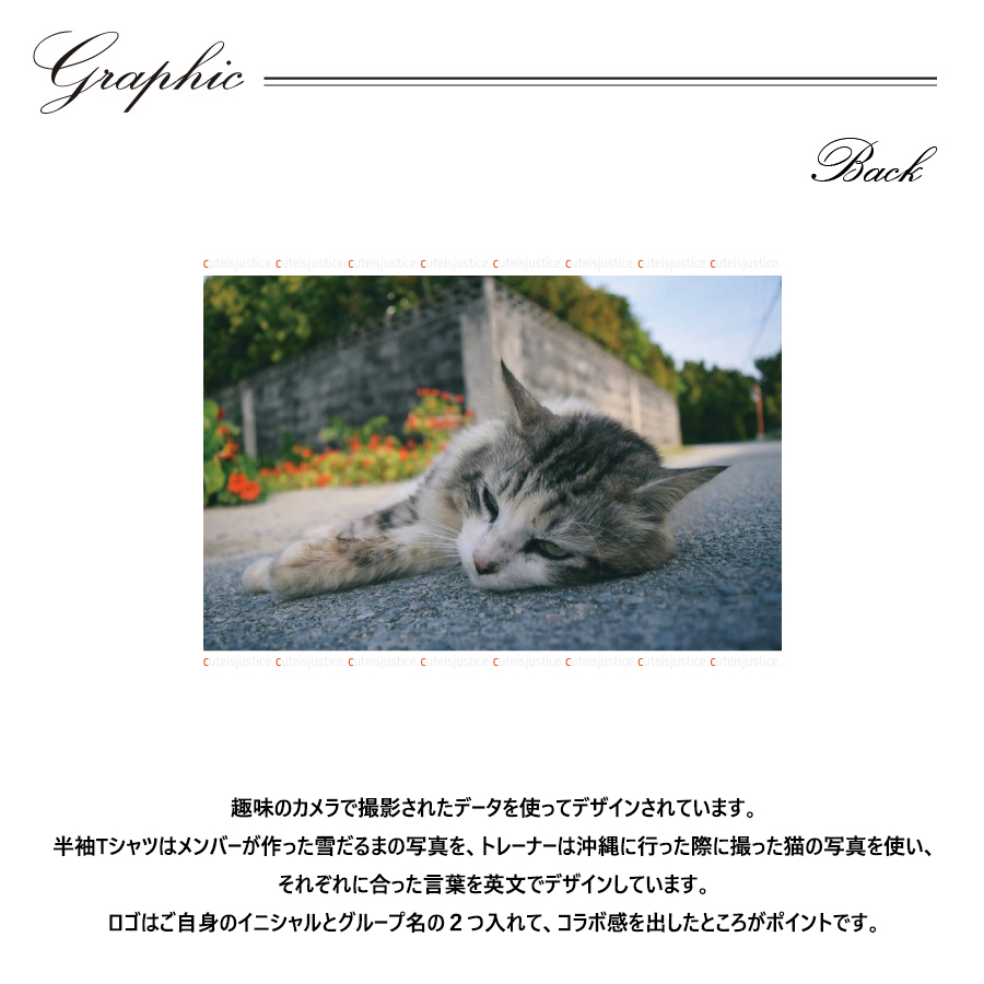| 商品Data | 笠谷朗さんとのコラボ企画! 今回のコラボは半袖Tシャツ、トレーナー、ブレスレットをリリース。 【デザイン】 趣味のカメラで撮影されたデータを使ってデザインされています。 半袖Tシャツはメンバーが作った雪だるまの写真を、 トレーナーは沖縄に行った際に撮った猫の写真を使い、 それぞれに合った言葉を英文でデザインしています。 ロゴはご自身のイニシャルとグループ名の2つ入れて、コラボ感を出したところがポイントです。 ここでしか手に入らない受注期間限定アイテムです!是非お買い求めください!!! ※商品の発送予定時期は【12月中旬頃〜12月下旬頃順次発送予定】 となります。 ※受注生産の為、発送予定時期が前後する場合がございます。 ※高額注文の場合には ご注文後にお電話にてご連絡をさせていただく場合がございます。 お電話にてご連絡が取れない場合にはメールにてご連絡させていただき、 ご連絡日より3日以内にご返信をいただけない場合には不正注文の可能性があると判断し トラブル防止のためご注文をキャンセルとさせていただきます。 ※商品によっては撮影時にサンプルを使用しているため若干仕様が異なる場合がございます。 また、サイズ・カラーによっては仕様が異なる場合もございます。 ※手作業で縫製をしているため縫製の仕様により、 個体差が生じてしまいますので、1~2cm程度の誤差は予めご了承くださいませ。 ※洗濯機を使用した場合、お届け時のサイズより多少縮む場合がございます。 洗濯機を使用する場合は裏返してネットに入れることを推奨しております。 また、タンブラー乾燥機を使用しますとプリントが剥がれる恐れがありますので 避けていただきますようお願いいたします。 また、洗濯時の液温は40度以下とし、 塩素系および酸素系漂白剤の使用は避けていただきますようお願いいたします。 アイロンにつきましてもプリント及び刺繍部分は避け、 生地部分にアイロンをかける場合にはあて布をして110度(低温)にてお願いいたします。 ※また、受注生産とさせていただいておりますが、 各色・サイズ毎に生産数に限りがございます為、 生産数の上限に達しました場合在庫切れとなる場合がございます。 |