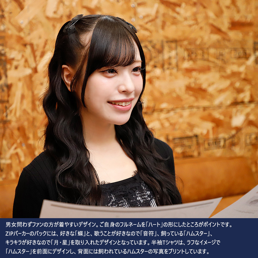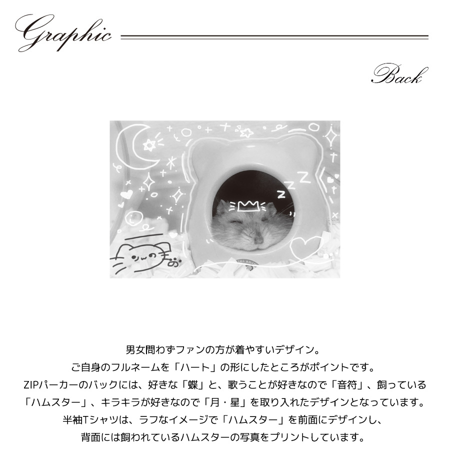 | 商品Data | 羽乃りんのさんとのコラボ企画! 今回のコラボは半袖Tシャツ、ZIPパーカー、キャップをリリース。 【デザイン】 男女問わずファンの方が着やすいデザイン。 ご自身のフルネームを「ハート」の形にしたところがポイントです。 ZIPパーカーのバックには、好きな「蝶」と、歌うことが好きなので「音符」、 飼っている「ハムスター」、キラキラが好きなので「月・星」を取り入れたデザインとなっています。 半袖Tシャツは、ラフなイメージで「ハムスター」を前面にデザインし、 背面には飼われているハムスターの写真をプリントしています。 ここでしか手に入らない受注期間限定アイテムです!是非お買い求めください!!!