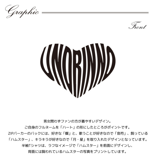| 商品Data | 羽乃りんのさんとのコラボ企画! 今回のコラボは半袖Tシャツ、ZIPパーカー、キャップをリリース。 【デザイン】 男女問わずファンの方が着やすいデザイン。 ご自身のフルネームを「ハート」の形にしたところがポイントです。 ZIPパーカーのバックには、好きな「蝶」と、歌うことが好きなので「音符」、 飼っている「ハムスター」、キラキラが好きなので「月・星」を取り入れたデザインとなっています。 半袖Tシャツは、ラフなイメージで「ハムスター」を前面にデザインし、 背面には飼われているハムスターの写真をプリントしています。 ここでしか手に入らない受注期間限定アイテムです!是非お買い求めください!!!