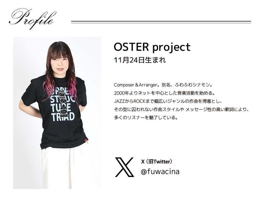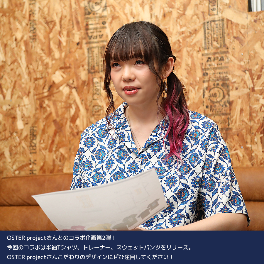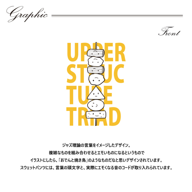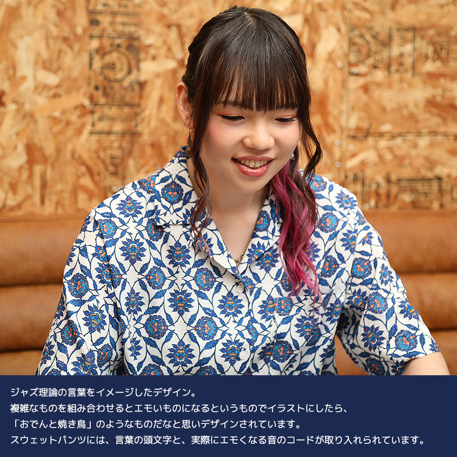 | 商品Data | OSTER projectさんとのコラボ企画第2弾! 今回のコラボは半袖Tシャツ、トレーナー、スウェットパンツをリリース。 【デザイン】 ジャズ理論の言葉をイメージしたデザイン。 複雑なものを組み合わせるとエモいものになるというもので イラストにしたら、「おでんと焼き鳥」のようなものだなと思いデザインされています。 スウェットパンツには、言葉の頭文字と、 実際にエモくなる音のコードが取り入れられています。 ここでしか手に入らない受注期間限定アイテムです!是非お買い求めください!!!