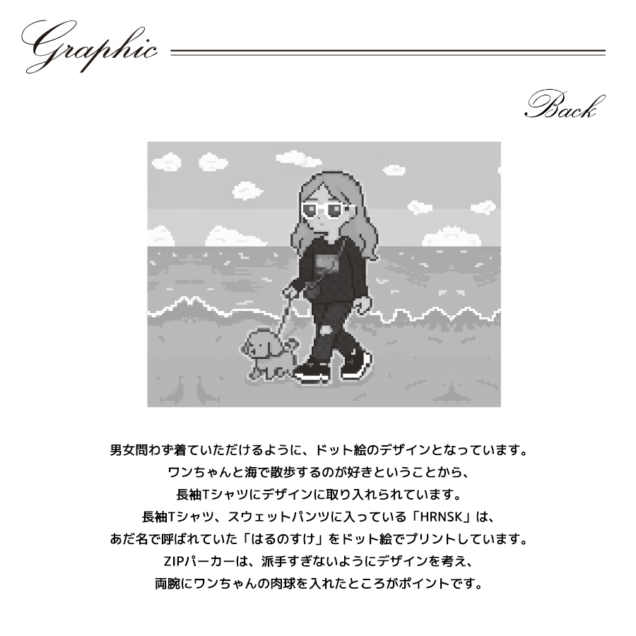 | 商品Data | 井上遥乃さんとのコラボ企画第2弾! 今回のコラボは長袖Tシャツ、ZIPパーカー、スウェットパンツをリリース。 【デザイン】 男女問わず着ていただけるように、ドット絵のデザインとなっています。 ワンちゃんと海で散歩するのが好きということから、 長袖Tシャツにデザインに取り入れられています。 長袖Tシャツ、スウェットパンツに入っている「HRNSK」は、あだ名で呼ばれていた 「はるのすけ」をドット絵でプリントしています。 ZIPパーカーは、派手すぎないようにデザインを考え、 両腕にワンちゃんの肉球を入れたところがポイントです。 ここでしか手に入らない受注期間限定アイテムです!是非お買い求めください!!! ※商品の発送予定時期は【12月下旬頃~1月上旬頃順次発送予定】 となります。 ※受注生産の為、発送予定時期が前後する場合がございます。 ※高額注文の場合には ご注文後にお電話にてご連絡をさせていただく場合がございます。 お電話にてご連絡が取れない場合にはメールにてご連絡させていただき、 ご連絡日より3日以内にご返信をいただけない場合には不正注文の可能性があると判断し トラブル防止のためご注文をキャンセルとさせていただきます。 ※商品によっては撮影時にサンプルを使用しているため若干仕様が異なる場合がございます。 また、サイズ・カラーによっては仕様が異なる場合もございます。 ※手作業で縫製をしているため縫製の仕様により、 個体差が生じてしまいますので、1~2cm程度の誤差は予めご了承くださいませ。 ※洗濯機を使用した場合、お届け時のサイズより多少縮む場合がございます。 洗濯機を使用する場合は裏返してネットに入れることを推奨しております。 また、タンブラー乾燥機を使用しますとプリントが剥がれる恐れがありますので 避けていただきますようお願いいたします。 また、洗濯時の液温は40度以下とし、 塩素系および酸素系漂白剤の使用は避けていただきますようお願いいたします。 アイロンにつきましてもプリント及び刺繍部分は避け、 生地部分にアイロンをかける場合にはあて布をして110度(低温)にてお願いいたします。 ※また、受注生産とさせていただいておりますが、 各色・サイズ毎に生産数に限りがございます為、 生産数の上限に達しました場合在庫切れとなる場合がございます。 |