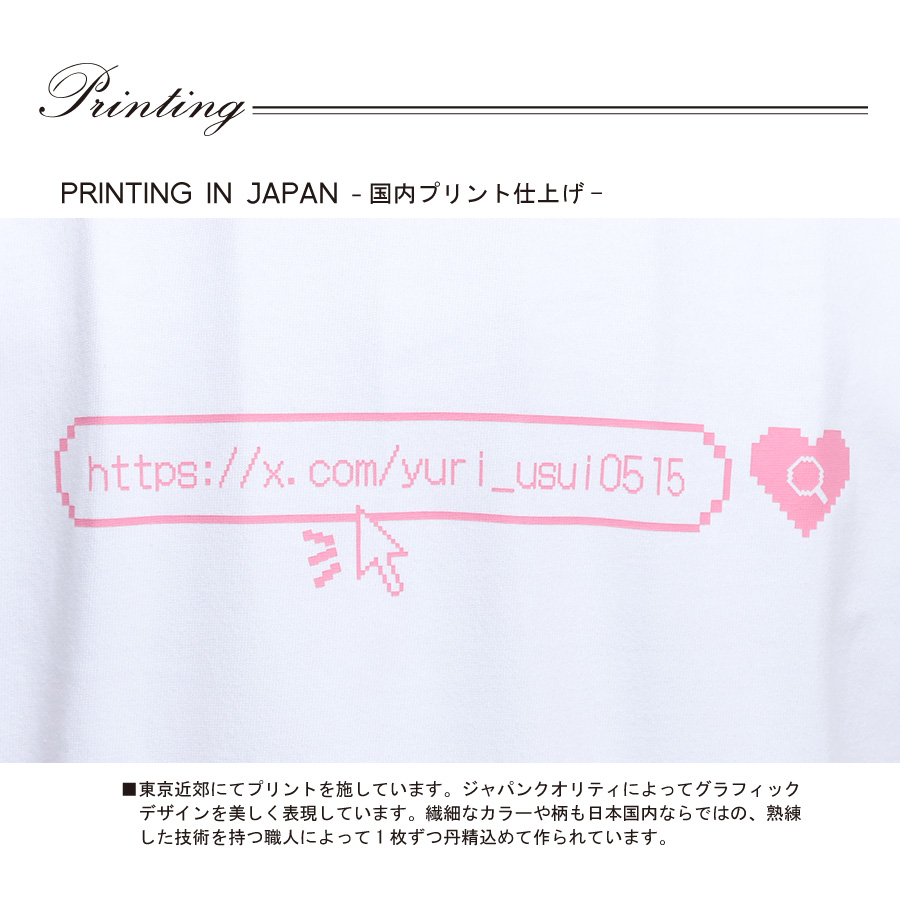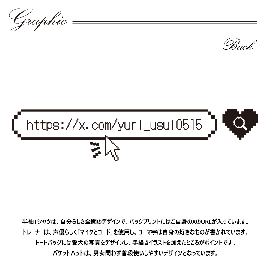 | 商品Data | 薄井友里さんとのコラボ企画! 今回のコラボは半袖Tシャツ、トレーナー、トートバッグ、バケットハットをリリース。 【デザイン】 半袖Tシャツは、自分らしさ全開のデザインで、バックプリントにはご自身のXのURLが入っています。 トレーナーは、声優らしく「マイクとコード」を使用し、ローマ字は自身の好きなものが書かれています。 トートバッグには愛犬の写真をデザインし、手描きイラストを加えたところがポイントです。 バケットハットは、男女問わず普段使いしやすいデザインとなっています。 ここでしか手に入らない受注期間限定アイテムです!是非お買い求めください!!! ※商品の発送予定時期は【1月中旬頃〜2月上旬頃順次発送予定】 となります。 ※受注生産の為、発送予定時期が前後する場合がございます。 ※高額注文の場合には ご注文後にお電話にてご連絡をさせていただく場合がございます。 お電話にてご連絡が取れない場合にはメールにてご連絡させていただき、 ご連絡日より3日以内にご返信をいただけない場合には不正注文の可能性があると判断し トラブル防止のためご注文をキャンセルとさせていただきます。 ※商品によっては撮影時にサンプルを使用しているため若干仕様が異なる場合がございます。 また、サイズ・カラーによっては仕様が異なる場合もございます。 ※手作業で縫製をしているため縫製の仕様により、 個体差が生じてしまいますので、1~2cm程度の誤差は予めご了承くださいませ。 ※洗濯機を使用した場合、お届け時のサイズより多少縮む場合がございます。 洗濯機を使用する場合は裏返してネットに入れることを推奨しております。 また、タンブラー乾燥機を使用しますとプリントが剥がれる恐れがありますので 避けていただきますようお願いいたします。 また、洗濯時の液温は40度以下とし、 塩素系および酸素系漂白剤の使用は避けていただきますようお願いいたします。 アイロンにつきましてもプリント及び刺繍部分は避け、 生地部分にアイロンをかける場合にはあて布をして110度(低温)にてお願いいたします。 ※また、受注生産とさせていただいておりますが、 各色・サイズ毎に生産数に限りがございます為、 生産数の上限に達しました場合在庫切れとなる場合がございます。 |
