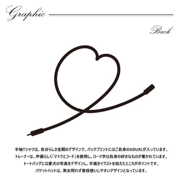 | 商品Data | 薄井友里さんとのコラボ企画! 今回のコラボは半袖Tシャツ、トレーナー、トートバッグ、バケットハットをリリース。 【デザイン】 半袖Tシャツは、自分らしさ全開のデザインで、バックプリントにはご自身のXのURLが入っています。 トレーナーは、声優らしく「マイクとコード」を使用し、ローマ字は自身の好きなものが書かれています。 トートバッグには愛犬の写真をデザインし、手描きイラストを加えたところがポイントです。 バケットハットは、男女問わず普段使いしやすいデザインとなっています。 ここでしか手に入らない受注期間限定アイテムです!是非お買い求めください!!! ※商品の発送予定時期は【1月中旬頃〜2月上旬頃順次発送予定】 となります。 ※受注生産の為、発送予定時期が前後する場合がございます。 ※高額注文の場合には ご注文後にお電話にてご連絡をさせていただく場合がございます。 お電話にてご連絡が取れない場合にはメールにてご連絡させていただき、 ご連絡日より3日以内にご返信をいただけない場合には不正注文の可能性があると判断し トラブル防止のためご注文をキャンセルとさせていただきます。 ※商品によっては撮影時にサンプルを使用しているため若干仕様が異なる場合がございます。 また、サイズ・カラーによっては仕様が異なる場合もございます。 ※手作業で縫製をしているため縫製の仕様により、 個体差が生じてしまいますので、1~2cm程度の誤差は予めご了承くださいませ。 ※洗濯機を使用した場合、お届け時のサイズより多少縮む場合がございます。 洗濯機を使用する場合は裏返してネットに入れることを推奨しております。 また、タンブラー乾燥機を使用しますとプリントが剥がれる恐れがありますので 避けていただきますようお願いいたします。 また、洗濯時の液温は40度以下とし、 塩素系および酸素系漂白剤の使用は避けていただきますようお願いいたします。 アイロンにつきましてもプリント及び刺繍部分は避け、 生地部分にアイロンをかける場合にはあて布をして110度(低温)にてお願いいたします。 ※また、受注生産とさせていただいておりますが、 各色・サイズ毎に生産数に限りがございます為、 生産数の上限に達しました場合在庫切れとなる場合がございます。 |