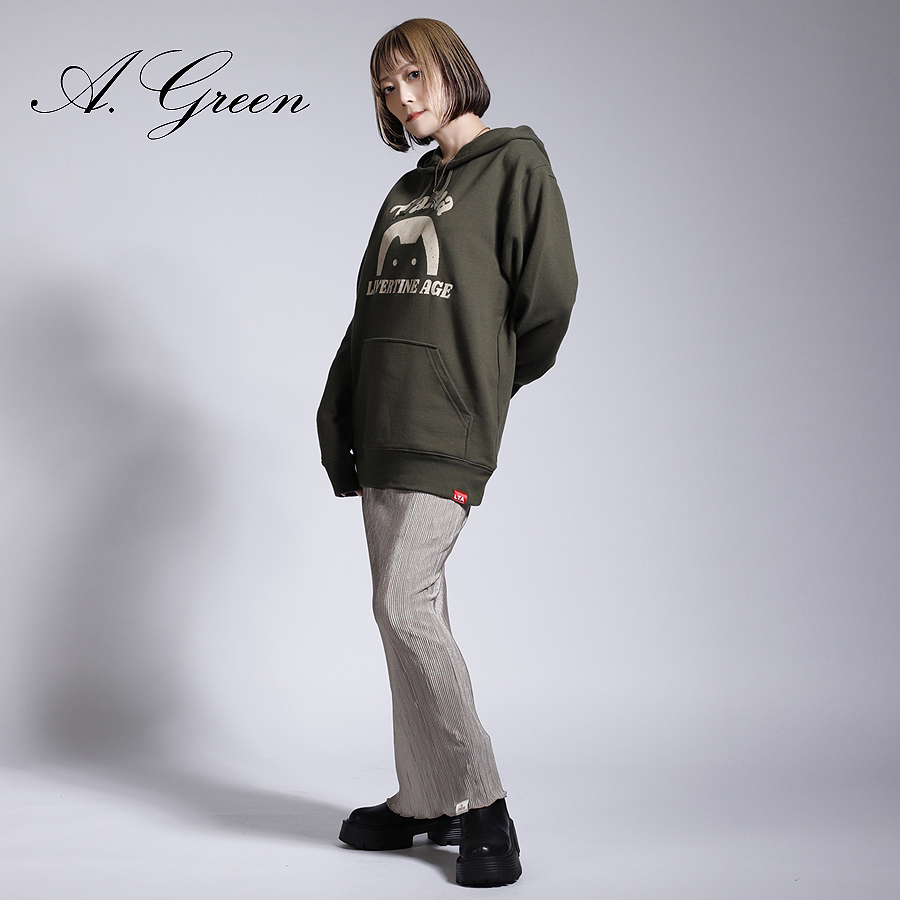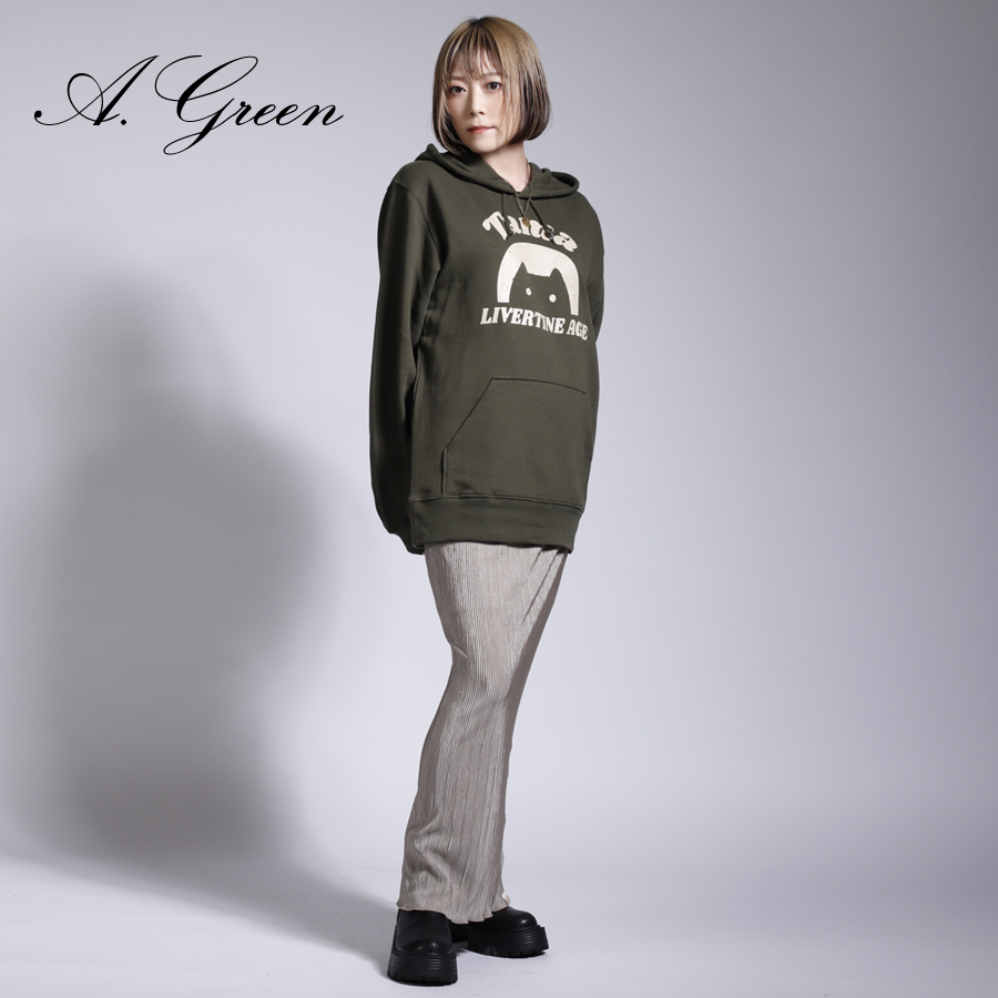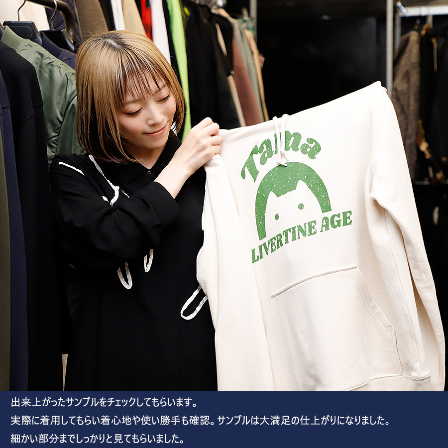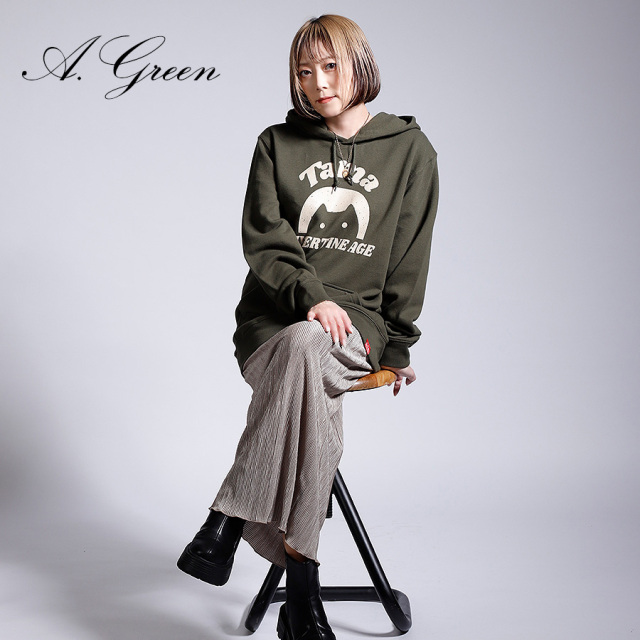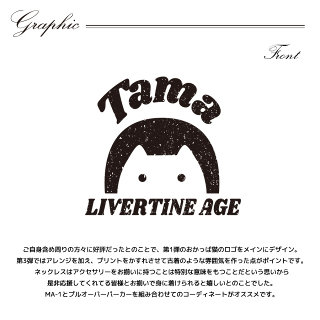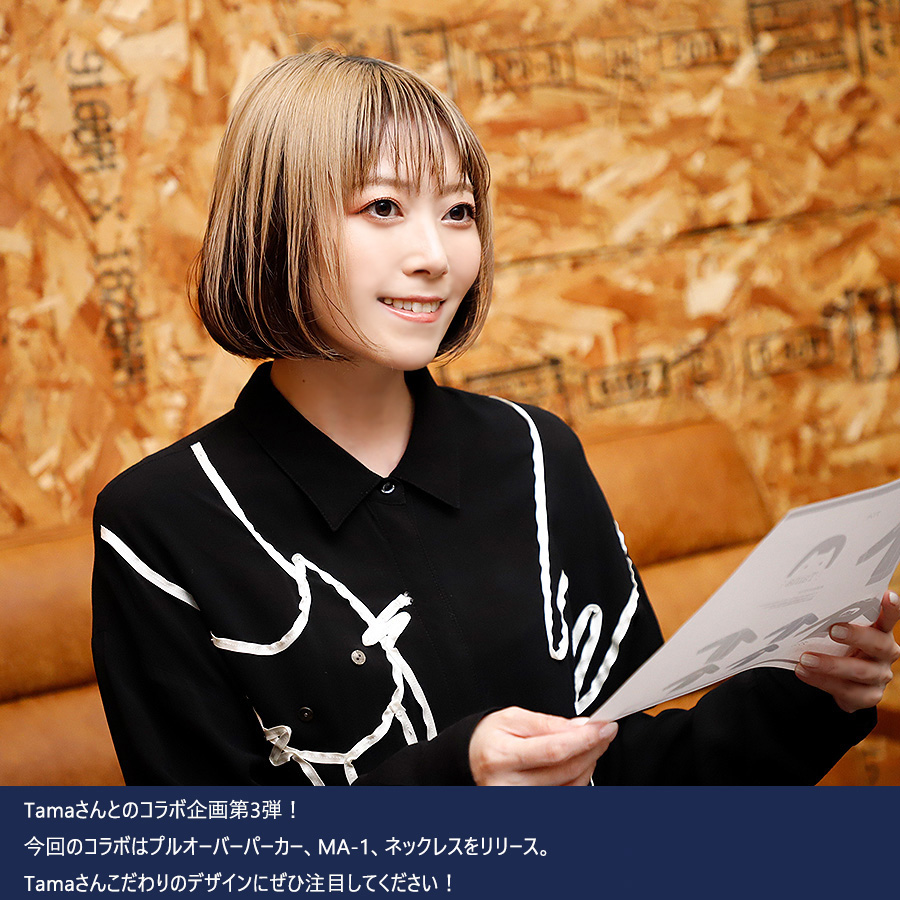 | 商品Data | Tamaさんとのコラボ企画第3弾! 今回のコラボはプルオーバーパーカー、MA-1、ネックレスをリリース。 【デザイン】 ご自身含め周りの方々に好評だったとのことで、第1弾のおかっぱ猫のロゴをメインにデザイン。 第3弾ではアレンジを加え、プリントをかすれさせて古着のような雰囲気を作った点がポイントです。 ネックレスはアクセサリーをお揃いに持つことは特別な意味をもつことだという思いから是非応援してくれてる皆様とお揃いで身に着けられると嬉しいとのことでした。 MA-1とプルオーバーパーカーを組み合わせてのコーディネートがオススメです。 ここでしか手に入らない受注期間限定アイテムです!是非お買い求めください!!!