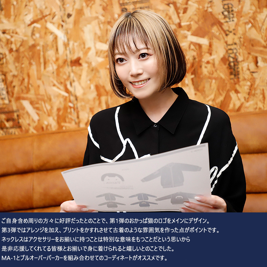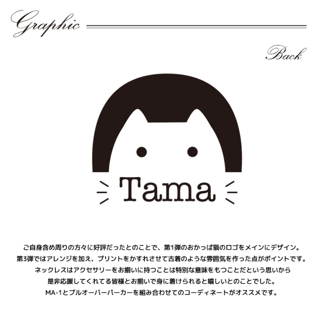 | 商品Data | Tamaさんとのコラボ企画第3弾! 今回のコラボはプルオーバーパーカー、MA-1、ネックレスをリリース。 【デザイン】 ご自身含め周りの方々に好評だったとのことで、第1弾のおかっぱ猫のロゴをメインにデザイン。 第3弾ではアレンジを加え、プリントをかすれさせて古着のような雰囲気を作った点がポイントです。 ネックレスはアクセサリーをお揃いに持つことは特別な意味をもつことだという思いから是非応援してくれてる皆様とお揃いで身に着けられると嬉しいとのことでした。 MA-1とプルオーバーパーカーを組み合わせてのコーディネートがオススメです。 ここでしか手に入らない受注期間限定アイテムです!是非お買い求めください!!! ※商品の発送予定時期は【1月下旬頃〜2月上旬頃順次発送予定】 となります。 ※受注生産の為、発送予定時期が前後する場合がございます。 ※商品代金が10万円以上にて代引き決済を利用してのご注文につきましては、 トラブル防止のため、決済方法をクレジットカード決済もしくはコンビニ決済に変更 させていただく場合がございます。変更前にお電話、メールにてご連絡をさせていただきます。※ ※商品によっては撮影時にサンプルを使用しているため若干仕様が異なる場合がございます。 また、サイズ・カラーによっては仕様が異なる場合もございます。 ※手作業で縫製をしているため縫製の仕様により、 個体差が生じてしまいますので、1~2cm程度の誤差は予めご了承くださいませ。 ※洗濯機を使用した場合、お届け時のサイズより多少縮む場合がございます。 洗濯機を使用する場合は裏返してネットに入れることを推奨しております。 また、タンブラー乾燥機を使用しますとプリントが剥がれる恐れがありますので 避けていただきますようお願いいたします。 また、洗濯時の液温は40度以下とし、 塩素系および酸素系漂白剤の使用は避けていただきますようお願いいたします。 アイロンにつきましてもプリント及び刺繍部分は避け、 生地部分にアイロンをかける場合にはあて布をして110度(低温)にてお願いいたします。 ※また、受注生産とさせていただいておりますが、 各色・サイズ毎に生産数に限りがございます為、 生産数の上限に達しました場合在庫切れとなる場合がございます。 予めご了承頂けますようお願い致します。 |