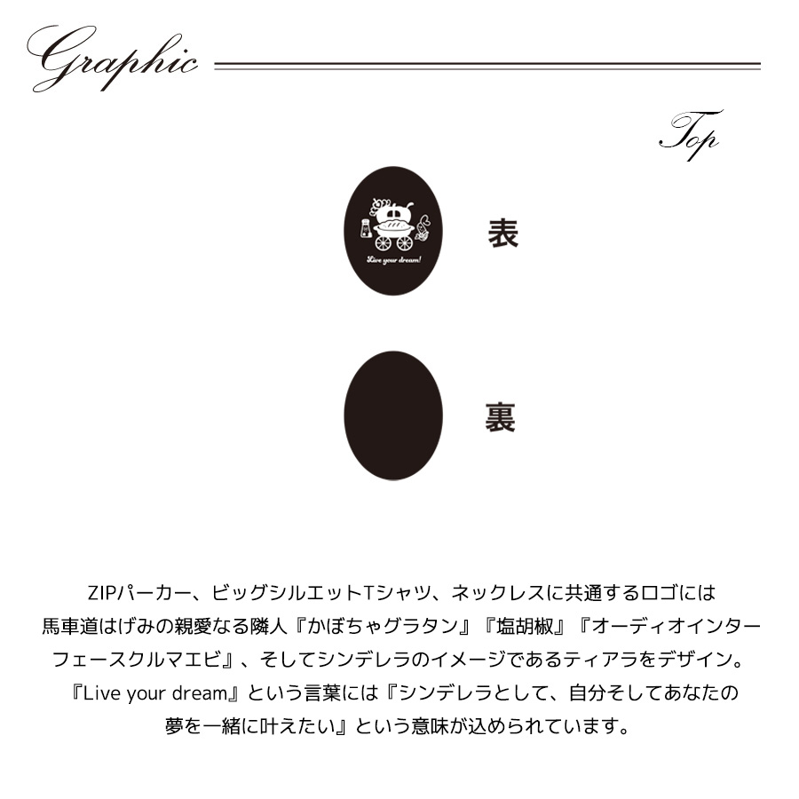 ※レディース・メンズモデル着用画像はコンポジットイメージとなります。 馬車道はげみさんとのコラボ企画! 今回のコラボはZIPパーカー、ビッグシルエット半袖Tシャツ、ネックレスをリリース。 【デザイン】 ZIPパーカー、ビッグシルエットTシャツ、ネックレスに共通するロゴには 馬車道はげみの親愛なる隣人『かぼちゃグラタン』『塩胡椒』『オーディオインター フェースクルマエビ』、そしてシンデレラのイメージであるティアラをデザイン。 『Live your dream』という言葉には『シンデレラとして、自分そしてあなたの 夢を一緒に叶えたい』という意味が込められています。 ここでしか手に入らない受注期間限定アイテムです!是非お買い求めください!!! メッキ加工:国内加工 原型作成:国内 ※商品に付いているタグを取り外す際には破損の恐れがあるため必ずハサミを使用するようお願いします。 ※アレルギーの反応等がその時の体調や個人差により出る場合がございますので、 金属製アクセサリーを初めてご使用の場合は必ず「パッチテスト」をしてご使用ください。※ 【パッチテストとは】 金属アレルギーの場合、特殊なテープに24種類の金属試薬をつけてアレルギーの有無を調べる検査です。 皮膚科などで相談をすれば身近にできる検査です。 いくつか検査中に注意する点がありますのでテストを受ける病院で検査について相談してください。 ※現時点での商品の発送予定時期は【2月中旬頃〜2月下旬頃順次発送予定】 となります。 ※受注生産の為、発送予定時期が前後する場合がございます。 ※高額注文の場合には ご注文後にお電話にてご連絡をさせていただく場合がございます。 お電話にてご連絡が取れない場合にはメールにてご連絡させていただき、 ご連絡日より3日以内にご返信をいただけない場合には不正注文の可能性があると判断し トラブル防止のためご注文をキャンセルとさせていただきます。 また、受注生産とさせていただいておりますが、 各色・サイズ毎に生産数を設けさせて頂いております為、 生産数の上限に達しました場合在庫切れとなる場合がございます。 ※※商品画像は照明などの影響により実際の色と異なる場合がございます ※加工の特性上、仕上がり寸法及び色のニュアンスが多少異なることがあります。 |