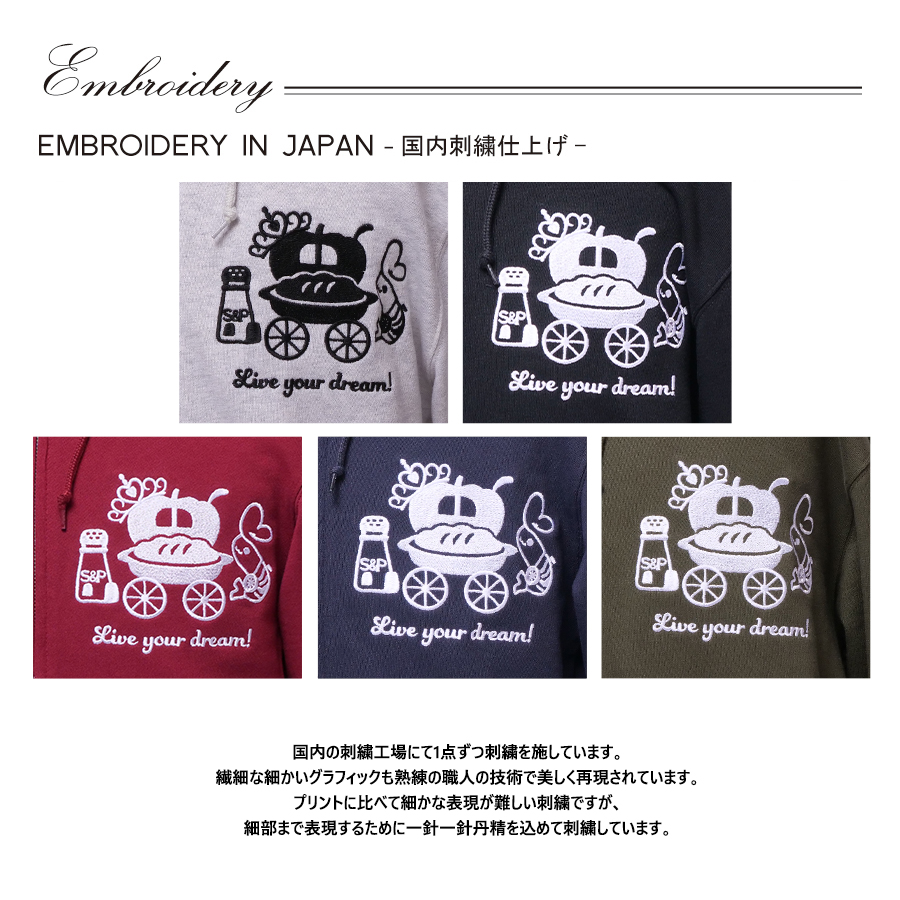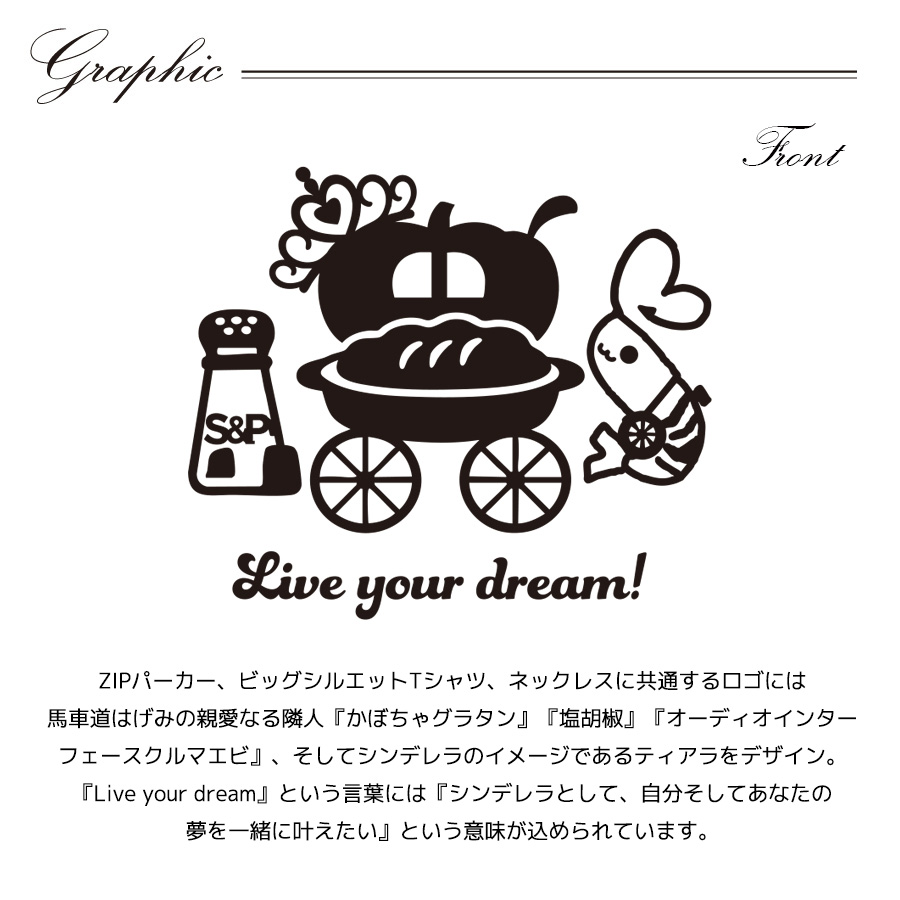 | 商品Data | 馬車道はげみさんとのコラボ企画! 今回のコラボはZIPパーカー、ビッグシルエット半袖Tシャツ、ネックレスをリリース。 【デザイン】 ZIPパーカー、ビッグシルエットTシャツ、ネックレスに共通するロゴには 馬車道はげみの親愛なる隣人『かぼちゃグラタン』『塩胡椒』『オーディオインター フェースクルマエビ』、そしてシンデレラのイメージであるティアラをデザイン。 『Live your dream』という言葉には『シンデレラとして、自分そしてあなたの 夢を一緒に叶えたい』という意味が込められています。 ここでしか手に入らない受注期間限定アイテムです!是非お買い求めください!!! ※商品の発送予定時期は 【2月中旬頃〜2月下旬頃順次発送予定】 となります。 ※受注生産の為、発送予定時期が前後する場合がございます。 ※高額注文の場合にはご注文後にお電話にてご連絡をさせていただく場合がございます。 お電話にてご連絡が取れない場合にはメールにてご連絡させていただき、 ご連絡日より3日以内にご返信をいただけない場合には不正注文の可能性があると判断し トラブル防止のためご注文をキャンセルとさせていただきます。 ※商品によっては撮影時にサンプルを使用しているため若干仕様が異なる場合がございます。 また、サイズ・カラーによっては仕様が異なる場合もございます。 ※手作業で縫製をしているため縫製の仕様により、 個体差が生じてしまいますので、1~2cm程度の誤差は予めご了承くださいませ。 ※洗濯機を使用した場合、お届け時のサイズより多少縮む場合がございます。 洗濯機を使用する場合は裏返してネットに入れることを推奨しております。 また、タンブラー乾燥機を使用しますとプリントが剥がれる恐れがありますので 避けていただきますようお願いいたします。 また、洗濯時の液温は40度以下とし、 塩素系および酸素系漂白剤の使用は避けていただきますようお願いいたします。 アイロンにつきましてもプリント及び刺繍部分は避け、 生地部分にアイロンをかける場合にはあて布をして110度(低温)にてお願いいたします。 ※また、受注生産とさせていただいておりますが、 各色・サイズ毎に生産数に限りがございます為、 生産数の上限に達しました場合在庫切れとなる場合がございます。 |