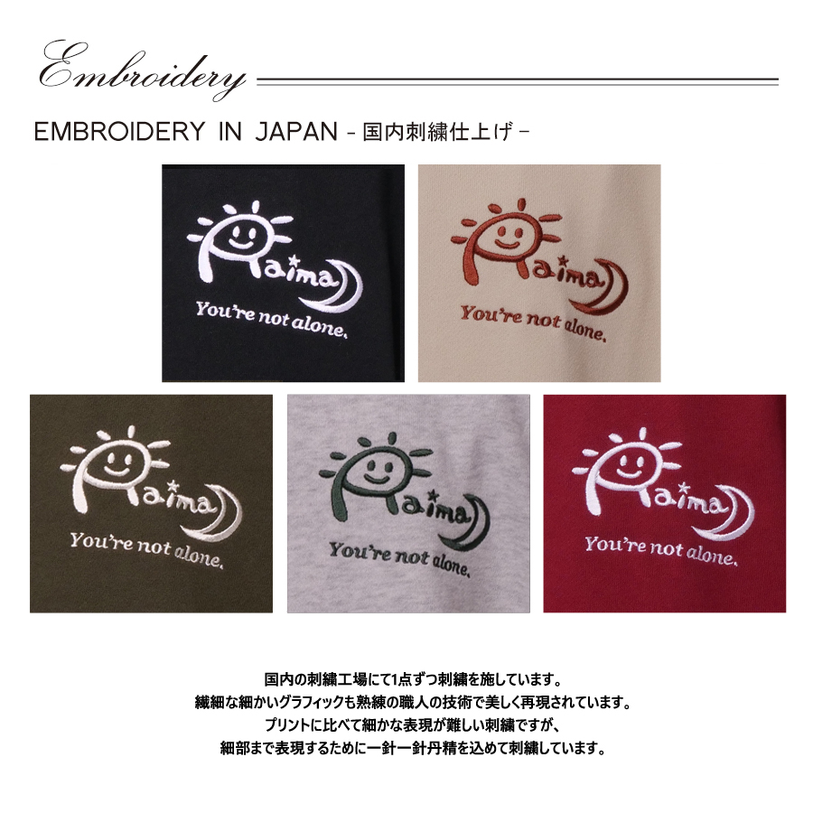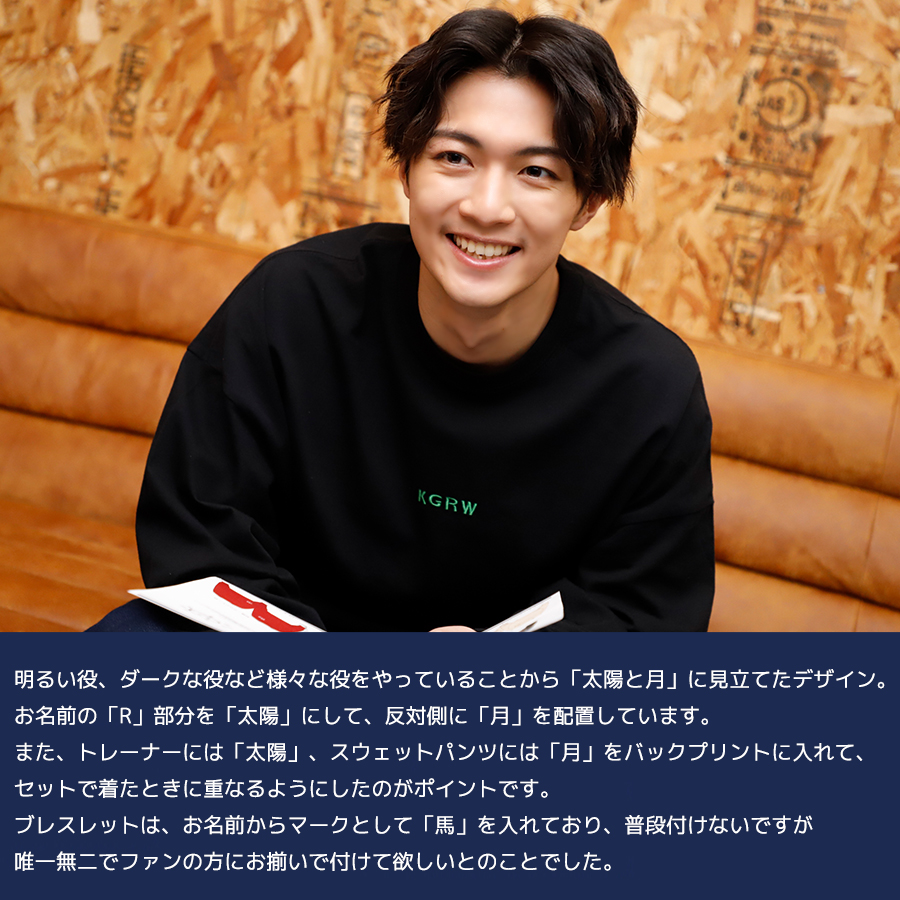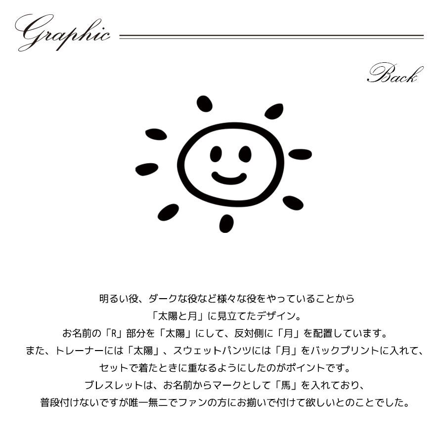| 商品Data | 平松來馬さんとのコラボ企画第2弾! 今回のコラボはトレーナー、スウェットパンツ、ブレスレットをリリース。 【デザイン】 明るい役、ダークな役など様々な役をやっていることから 「太陽と月」に見立てたデザイン。 お名前の「R」部分を「太陽」にして、反対側に「月」を配置しています。 また、トレーナーには「太陽」、スウェットパンツには「月」をバックプリントに入れて、 セットで着たときに重なるようにしたのがポイントです。 ブレスレットは、お名前からマークとして「馬」を入れており、 普段付けないですが唯一無二でファンの方にお揃いで付けて欲しいとのことでした。 ここでしか手に入らない受注期間限定アイテムです!是非お買い求めください!!! ※商品の発送予定時期は【4月上旬頃~4月中旬頃順次発送予定】 となります。 ※受注生産の為、発送予定時期が前後する場合がございます。 ※高額注文の場合には ご注文後にお電話にてご連絡をさせていただく場合がございます。 お電話にてご連絡が取れない場合にはメールにてご連絡させていただき、 ご連絡日より3日以内にご返信をいただけない場合には不正注文の可能性があると判断し トラブル防止のためご注文をキャンセルとさせていただきます。 ※商品によっては撮影時にサンプルを使用しているため若干仕様が異なる場合がございます。 また、サイズ・カラーによっては仕様が異なる場合もございます。 ※手作業で縫製をしているため縫製の仕様により、 個体差が生じてしまいますので、1~2cm程度の誤差は予めご了承くださいませ。 ※洗濯機を使用した場合、お届け時のサイズより多少縮む場合がございます。 洗濯機を使用する場合は裏返してネットに入れることを推奨しております。 また、タンブラー乾燥機を使用しますとプリントが剥がれる恐れがありますので 避けていただきますようお願いいたします。 また、洗濯時の液温は40度以下とし、 塩素系および酸素系漂白剤の使用は避けていただきますようお願いいたします。 アイロンにつきましてもプリント及び刺繍部分は避け、 生地部分にアイロンをかける場合にはあて布をして110度(低温)にてお願いいたします。 ※また、受注生産とさせていただいておりますが、 各色・サイズ毎に生産数に限りがございます為、 生産数の上限に達しました場合在庫切れとなる場合がございます。 |