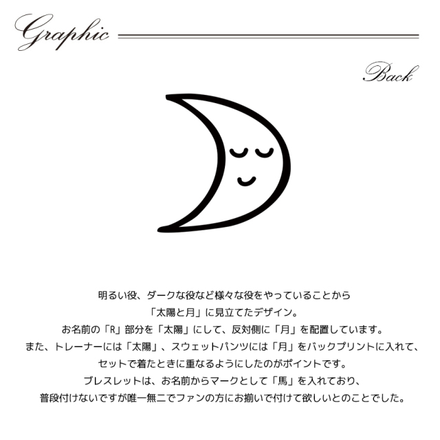 | 商品Data | 平松來馬さんとのコラボ企画第2弾! 今回のコラボはトレーナー、スウェットパンツ、ブレスレットをリリース。 【デザイン】 明るい役、ダークな役など様々な役をやっていることから 「太陽と月」に見立てたデザイン。 お名前の「R」部分を「太陽」にして、反対側に「月」を配置しています。 また、トレーナーには「太陽」、スウェットパンツには「月」をバックプリントに入れて、 セットで着たときに重なるようにしたのがポイントです。 ブレスレットは、お名前からマークとして「馬」を入れており、 普段付けないですが唯一無二でファンの方にお揃いで付けて欲しいとのことでした。 ここでしか手に入らない受注期間限定アイテムです!是非お買い求めください!!! ※商品の発送予定時期は【4月上旬頃~4月中旬頃順次発送予定】 となります。 ※受注生産の為、発送予定時期が前後する場合がございます。 ※高額注文の場合には ご注文後にお電話にてご連絡をさせていただく場合がございます。 お電話にてご連絡が取れない場合にはメールにてご連絡させていただき、 ご連絡日より3日以内にご返信をいただけない場合には不正注文の可能性があると判断し トラブル防止のためご注文をキャンセルとさせていただきます。 ※商品によっては撮影時にサンプルを使用しているため若干仕様が異なる場合がございます。 また、サイズ・カラーによっては仕様が異なる場合もございます。 ※手作業で縫製をしているため縫製の仕様により、 個体差が生じてしまいますので、1~2cm程度の誤差は予めご了承くださいませ。 ※洗濯機を使用した場合、お届け時のサイズより多少縮む場合がございます。 洗濯機を使用する場合は裏返してネットに入れることを推奨しております。 また、タンブラー乾燥機を使用しますとプリントが剥がれる恐れがありますので 避けていただきますようお願いいたします。 また、洗濯時の液温は40度以下とし、 塩素系および酸素系漂白剤の使用は避けていただきますようお願いいたします。 アイロンにつきましてもプリント及び刺繍部分は避け、 生地部分にアイロンをかける場合にはあて布をして110度(低温)にてお願いいたします。 ※また、受注生産とさせていただいておりますが、 各色・サイズ毎に生産数に限りがございます為、 生産数の上限に達しました場合在庫切れとなる場合がございます。 |