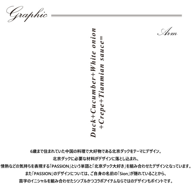 | 商品Data | 吉高志音さんとのコラボ企画! 今回のコラボは長袖Tシャツ、ZIPパーカー、トートバッグをリリース。 【デザイン】 6歳まで住まれていた中国の料理で大好物である北京ダックをテーマにデザイン。 北京ダックに必要な材料がデザインに落とし込まれ、 情熱などの気持ちを表現する「PASSION」という単語と 「北京ダック大好き」を組み合わせたデザインとなっています。 また「PASSION」のデザインについては、ご自身の名前の「Sion」が隠れていることから、 苗字のイニシャルを組み合わせたシンプルかつコラボアイテムならではの デザインもポイントです。 ここでしか手に入らない受注期間限定アイテムです!是非お買い求めください!!! ※商品の発送予定時期は【3月中旬頃~3月下旬頃順次発送予定】 となります。 ※受注生産の為、発送予定時期が前後する場合がございます。 ※高額注文の場合には ご注文後にお電話にてご連絡をさせていただく場合がございます。 お電話にてご連絡が取れない場合にはメールにてご連絡させていただき、 ご連絡日より3日以内にご返信をいただけない場合には不正注文の可能性があると判断し トラブル防止のためご注文をキャンセルとさせていただきます。 ※商品によっては撮影時にサンプルを使用しているため若干仕様が異なる場合がございます。 また、サイズ・カラーによっては仕様が異なる場合もございます。 ※手作業で縫製をしているため縫製の仕様により、 個体差が生じてしまいますので、1~2cm程度の誤差は予めご了承くださいませ。 ※洗濯機を使用した場合、お届け時のサイズより多少縮む場合がございます。 洗濯機を使用する場合は裏返してネットに入れることを推奨しております。 また、タンブラー乾燥機を使用しますとプリントが剥がれる恐れがありますので 避けていただきますようお願いいたします。 また、洗濯時の液温は40度以下とし、 塩素系および酸素系漂白剤の使用は避けていただきますようお願いいたします。 アイロンにつきましてもプリント及び刺繍部分は避け、 生地部分にアイロンをかける場合にはあて布をして110度(低温)にてお願いいたします。 ※また、受注生産とさせていただいておりますが、 各色・サイズ毎に生産数に限りがございます為、 生産数の上限に達しました場合在庫切れとなる場合がございます。 |