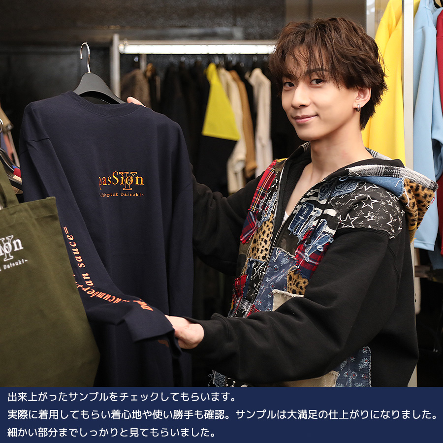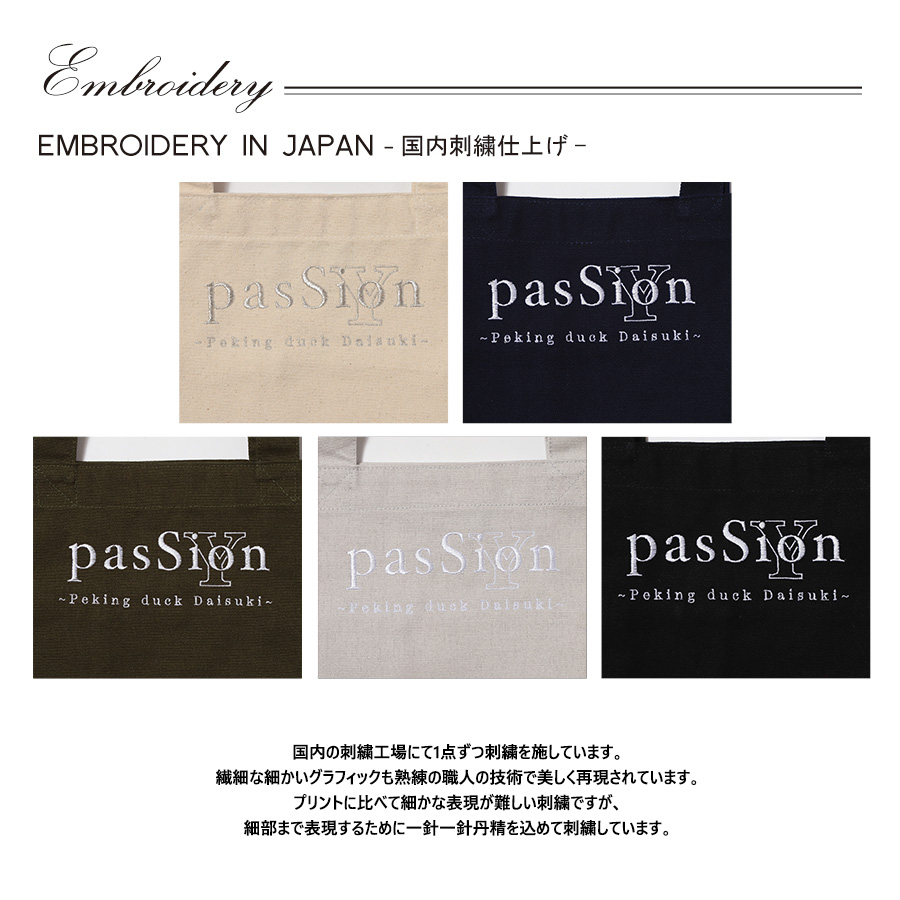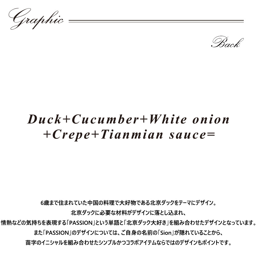 | 商品Data | 吉高志音さんとのコラボ企画! 今回のコラボは長袖Tシャツ、ZIPパーカー、トートバッグをリリース。 【デザイン】 6歳まで住まれていた中国の料理で大好物である北京ダックをテーマにデザイン。 北京ダックに必要な材料がデザインに落とし込まれ、 情熱などの気持ちを表現する「PASSION」という単語と 「北京ダック大好き」を組み合わせたデザインとなっています。 また「PASSION」のデザインについては、ご自身の名前の「Sion」が隠れていることから、 苗字のイニシャルを組み合わせたシンプルかつコラボアイテムならではの デザインもポイントです。 ここでしか手に入らない受注期間限定アイテムです!是非お買い求めください!!! ※商品の発送予定時期は 【3月中旬頃~3月下旬頃順次発送予定】 となります。 ※受注生産の為、発送予定時期が前後する場合がございます。 ※高額注文の場合には ご注文後にお電話にてご連絡をさせていただく場合がございます。 お電話にてご連絡が取れない場合にはメールにてご連絡させていただき、 ご連絡日より3日以内にご返信をいただけない場合には不正注文の可能性があると判断し トラブル防止のためご注文をキャンセルとさせていただきます。 ※商品によっては撮影時にサンプルを使用しているため若干仕様が異なる場合がございます。 また、サイズ・カラーによっては仕様が異なる場合もございます。 ※手作業で縫製をしているため縫製の仕様により、 個体差が生じてしまいますので、1~2cm程度の誤差は予めご了承くださいませ。 ※洗濯機を使用した場合、お届け時のサイズより多少縮む場合がございます。 洗濯機を使用する場合は裏返してネットに入れることを推奨しております。 また、タンブラー乾燥機を使用しますとプリントが剥がれる恐れがありますので 避けていただきますようお願いいたします。 また、洗濯時の液温は40度以下とし、 塩素系および酸素系漂白剤の使用は避けていただきますようお願いいたします。 アイロンにつきましてもプリント及び刺繍部分は避け、 生地部分にアイロンをかける場合にはあて布をして110度(低温)にてお願いいたします。 ※また、受注生産とさせていただいておりますが、 各色・サイズ毎に生産数に限りがございます為、 生産数の上限に達しました場合在庫切れとなる場合がございます。 |