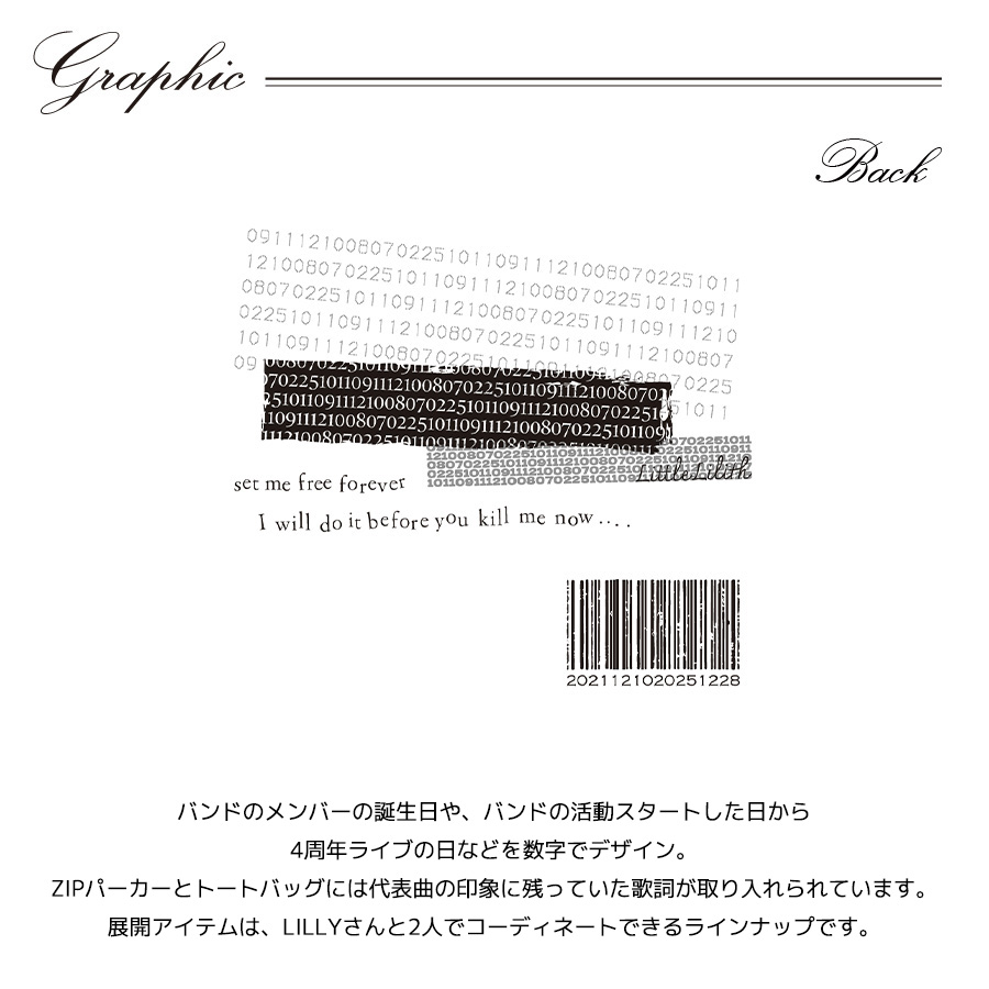 | 商品Data | YUKIさんとのコラボ企画! 今回のコラボはZIPパーカー、スウェットパンツ、トートバッグをリリース。 【デザイン】 バンドのメンバーの誕生日や、 バンドの活動スタートした日から4周年ライブの日などを数字でデザイン。 ZIPパーカーとトートバッグには 代表曲の印象に残っていた歌詞が取り入れられています。 展開アイテムは、LILLYさんと2人で コーディネートできるラインナップです。 ここでしか手に入らない受注期間限定アイテムです!是非お買い求めください!!! ※商品の発送予定時期は 【2月中旬頃~2月下旬頃順次発送】 となります。 ※受注生産の為、発送予定時期が前後する場合がございます。 ※高額注文の場合にはご注文後にお電話にてご連絡をさせていただく場合がございます。 お電話にてご連絡が取れない場合にはメールにてご連絡させていただき、 ご連絡日より3日以内にご返信をいただけない場合には不正注文の可能性があると判断し トラブル防止のためご注文をキャンセルとさせていただきます。 ※商品によっては撮影時にサンプルを使用しているため若干仕様が異なる場合がございます。 また、サイズ・カラーによっては仕様が異なる場合もございます。 ※手作業で縫製をしているため縫製の仕様により、 個体差が生じてしまいますので、1~2cm程度の誤差は予めご了承くださいませ。 ※洗濯機を使用した場合、お届け時のサイズより多少縮む場合がございます。 洗濯機を使用する場合は裏返してネットに入れることを推奨しております。 また、タンブラー乾燥機を使用しますとプリントが剥がれる恐れがありますので 避けていただきますようお願いいたします。 また、洗濯時の液温は40度以下とし、 塩素系および酸素系漂白剤の使用は避けていただきますようお願いいたします。 アイロンにつきましてもプリント及び刺繍部分は避け、 生地部分にアイロンをかける場合にはあて布をして110度(低温)にてお願いいたします。 ※また、受注生産とさせていただいておりますが、 各色・サイズ毎に生産数に限りがございます為、 生産数の上限に達しました場合在庫切れとなる場合がございます。 |