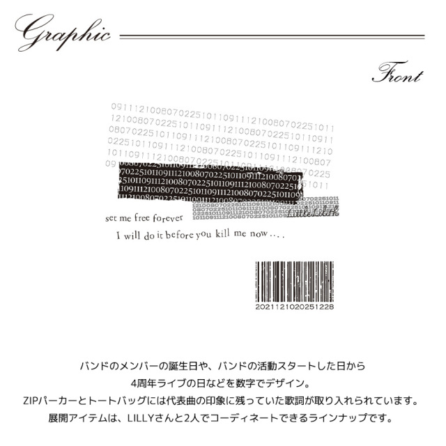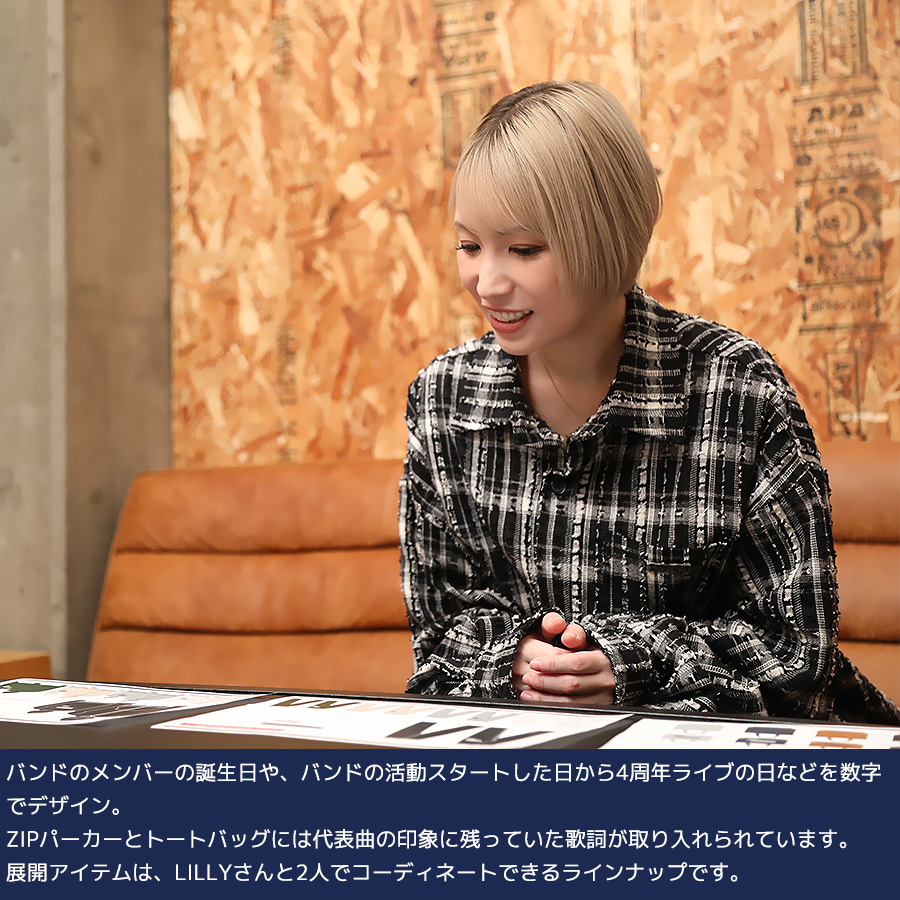 | 商品Data | YUKIさんとのコラボ企画! 今回のコラボはZIPパーカー、スウェットパンツ、トートバッグをリリース。 【デザイン】 バンドのメンバーの誕生日や、 バンドの活動スタートした日から4周年ライブの日などを数字でデザイン。 ZIPパーカーとトートバッグには 代表曲の印象に残っていた歌詞が取り入れられています。 展開アイテムは、LILLYさんと2人で コーディネートできるラインナップです。 ここでしか手に入らない受注期間限定アイテムです!是非お買い求めください!!! ※商品の発送予定時期は 【2月中旬頃~2月下旬頃順次発送】 となります。 ※受注生産の為、発送予定時期が前後する場合がございます。 ※高額注文の場合には ご注文後にお電話にてご連絡をさせていただく場合がございます。 お電話にてご連絡が取れない場合にはメールにてご連絡させていただき、 ご連絡日より3日以内にご返信をいただけない場合には不正注文の可能性があると判断し トラブル防止のためご注文をキャンセルとさせていただきます。 ※商品によっては撮影時にサンプルを使用しているため若干仕様が異なる場合がございます。 また、サイズ・カラーによっては仕様が異なる場合もございます。 ※手作業で縫製をしているため縫製の仕様により、 個体差が生じてしまいますので、1~2cm程度の誤差は予めご了承くださいませ。 ※洗濯機を使用した場合、お届け時のサイズより多少縮む場合がございます。 洗濯機を使用する場合は裏返してネットに入れることを推奨しております。 また、タンブラー乾燥機を使用しますとプリントが剥がれる恐れがありますので 避けていただきますようお願いいたします。 また、洗濯時の液温は40度以下とし、 塩素系および酸素系漂白剤の使用は避けていただきますようお願いいたします。 アイロンにつきましてもプリント及び刺繍部分は避け、 生地部分にアイロンをかける場合にはあて布をして110度(低温)にてお願いいたします。 ※また、受注生産とさせていただいておりますが、 各色・サイズ毎に生産数に限りがございます為、 生産数の上限に達しました場合在庫切れとなる場合がございます。 |