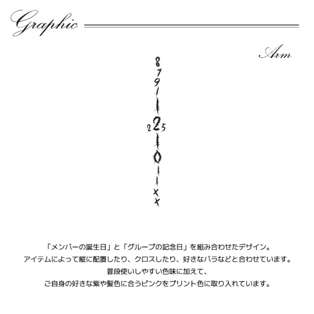 | 商品Data | LILLYさんとのコラボ企画! 今回のコラボは長袖Tシャツ、キャップ、ネックレス、バングルをリリース。 【デザイン】 「メンバーの誕生日」と「グループの記念日」を組み合わせたデザイン。 アイテムによって縦に配置したり、クロスしたり、好きなバラなどと合わせています。 普段使いしやすい色味に加えて、ご自身の好きな紫や髪色に合うピンクをプリント色に取り入れています。 ここでしか手に入らない受注期間限定アイテムです!是非お買い求めください!!! ※商品の発送予定時期は 【2月中旬頃~2月下旬頃順次発送】 となります。 ※受注生産の為、発送予定時期が前後する場合がございます。 ※高額注文の場合には ご注文後にお電話にてご連絡をさせていただく場合がございます。 お電話にてご連絡が取れない場合にはメールにてご連絡させていただき、 ご連絡日より3日以内にご返信をいただけない場合には不正注文の可能性があると判断し トラブル防止のためご注文をキャンセルとさせていただきます。 ※商品によっては撮影時にサンプルを使用しているため若干仕様が異なる場合がございます。 また、サイズ・カラーによっては仕様が異なる場合もございます。 ※手作業で縫製をしているため縫製の仕様により、 個体差が生じてしまいますので、1~2cm程度の誤差は予めご了承くださいませ。 ※洗濯機を使用した場合、お届け時のサイズより多少縮む場合がございます。 洗濯機を使用する場合は裏返してネットに入れることを推奨しております。 また、タンブラー乾燥機を使用しますとプリントが剥がれる恐れがありますので 避けていただきますようお願いいたします。 また、洗濯時の液温は40度以下とし、 塩素系および酸素系漂白剤の使用は避けていただきますようお願いいたします。 アイロンにつきましてもプリント及び刺繍部分は避け、 生地部分にアイロンをかける場合にはあて布をして110度(低温)にてお願いいたします。 ※また、受注生産とさせていただいておりますが、 各色・サイズ毎に生産数に限りがございます為、 生産数の上限に達しました場合在庫切れとなる場合がございます。 |
