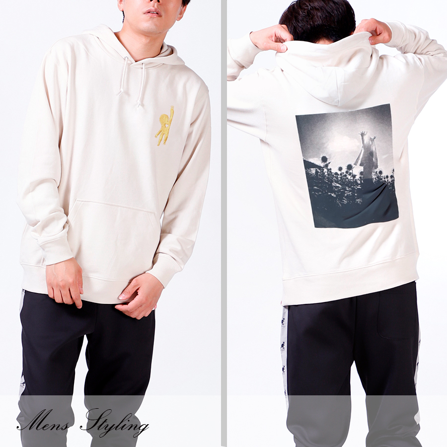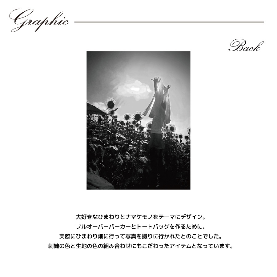 | 商品Data | 佃井皆美さんとのコラボ企画! 今回のコラボはプルオーバーパーカー、スウェットパンツ、トートバッグをリリース。 【デザイン】 大好きなひまわりとナマケモノをテーマにデザイン。 プルオーバーパーカーとトートバッグを作るために、 実際にひまわり畑に行って写真を撮りに行かれたとのことでした。 刺繍の色と生地の色の組み合わせにもこだわったアイテムとなっています。 ここでしか手に入らない受注期間限定アイテムです!是非お買い求めください!!!