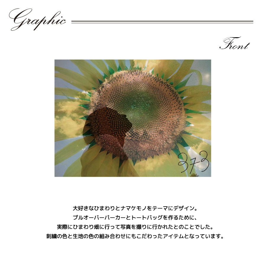 | 商品Data | 佃井皆美さんとのコラボ企画! 今回のコラボはプルオーバーパーカー、スウェットパンツ、トートバッグをリリース。 【デザイン】 大好きなひまわりとナマケモノをテーマにデザイン。 プルオーバーパーカーとトートバッグを作るために、 実際にひまわり畑に行って写真を撮りに行かれたとのことでした。 刺繍の色と生地の色の組み合わせにもこだわったアイテムとなっています。 ここでしか手に入らない受注期間限定アイテムです!是非お買い求めください!!! ※商品の発送予定時期は【2月下旬頃~3月上旬頃順次発送予定】 となります。 ※受注生産の為、発送予定時期が前後する場合がございます。 ※高額注文の場合には ご注文後にお電話にてご連絡をさせていただく場合がございます。 お電話にてご連絡が取れない場合にはメールにてご連絡させていただき、 ご連絡日より3日以内にご返信をいただけない場合には不正注文の可能性があると判断し トラブル防止のためご注文をキャンセルとさせていただきます。 ※商品によっては撮影時にサンプルを使用しているため若干仕様が異なる場合がございます。 また、サイズ・カラーによっては仕様が異なる場合もございます。 ※手作業で縫製をしているため縫製の仕様により、 個体差が生じてしまいますので、1~2cm程度の誤差は予めご了承くださいませ。 ※洗濯機を使用した場合、お届け時のサイズより多少縮む場合がございます。 洗濯機を使用する場合は裏返してネットに入れることを推奨しております。 また、タンブラー乾燥機を使用しますとプリントが剥がれる恐れがありますので 避けていただきますようお願いいたします。 また、洗濯時の液温は40度以下とし、 塩素系および酸素系漂白剤の使用は避けていただきますようお願いいたします。 アイロンにつきましてもプリント及び刺繍部分は避け、 生地部分にアイロンをかける場合にはあて布をして110度(低温)にてお願いいたします。 ※また、受注生産とさせていただいておりますが、 各色・サイズ毎に生産数に限りがございます為、 生産数の上限に達しました場合在庫切れとなる場合がございます。 |