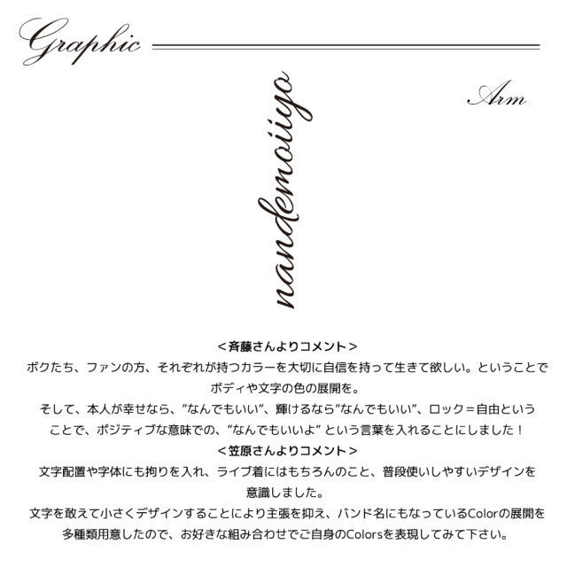 | 商品Data | Fam us Colors.さんとのコラボ企画! 今回のコラボは長袖Tシャツ、ZIPパーカー、スウェットパンツをリリース。 【デザイン】 <斉藤さんよりコメント> ボクたち、ファンの方、それぞれが持つカラーを大切に自信を持って生きて欲しい。 ということでボディや文字の色の展開を。 そして、本人が幸せなら、”なんでもいい”、輝けるなら”なんでもいい”、ロック=自由ということで、 ポジティブな意味での、”なんでもいいよ” という言葉を入れることにしました! <笠原さんよりコメント> 文字配置や字体にも拘りを入れ、ライブ着にはもちろんのこと、普段使いしやすいデザインを意識し ました。 文字を敢えて小さくデザインすることにより主張を抑え、バンド名にもなっているColorの展開を 多種類用意したので、お好きな組み合わせでご自身のColorsを表現してみて下さい。 ここでしか手に入らない受注期間限定アイテムです!是非お買い求めください!!! ※商品の発送予定時期は【2月下旬頃~3月上旬頃順次発送予定】 となります。 ※受注生産の為、発送予定時期が前後する場合がございます。 ※高額注文の場合には ご注文後にお電話にてご連絡をさせていただく場合がございます。 お電話にてご連絡が取れない場合にはメールにてご連絡させていただき、 ご連絡日より3日以内にご返信をいただけない場合には不正注文の可能性があると判断し トラブル防止のためご注文をキャンセルとさせていただきます。 ※商品によっては撮影時にサンプルを使用しているため若干仕様が異なる場合がございます。 また、サイズ・カラーによっては仕様が異なる場合もございます。 ※手作業で縫製をしているため縫製の仕様により、 個体差が生じてしまいますので、1~2cm程度の誤差は予めご了承くださいませ。 ※洗濯機を使用した場合、お届け時のサイズより多少縮む場合がございます。 洗濯機を使用する場合は裏返してネットに入れることを推奨しております。 また、タンブラー乾燥機を使用しますとプリントが剥がれる恐れがありますので 避けていただきますようお願いいたします。 また、洗濯時の液温は40度以下とし、 塩素系および酸素系漂白剤の使用は避けていただきますようお願いいたします。 アイロンにつきましてもプリント及び刺繍部分は避け、 生地部分にアイロンをかける場合にはあて布をして110度(低温)にてお願いいたします。 ※また、受注生産とさせていただいておりますが、 各色・サイズ毎に生産数に限りがございます為、 生産数の上限に達しました場合在庫切れとなる場合がございます。 |