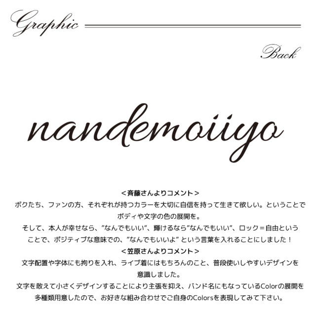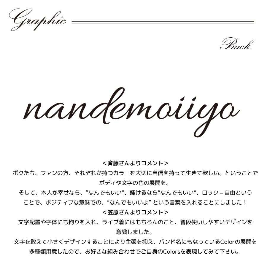 | 商品Data | Fam us Colors.さんとのコラボ企画! 今回のコラボは長袖Tシャツ、ZIPパーカー、スウェットパンツをリリース。 【デザイン】 <斉藤さんよりコメント> ボクたち、ファンの方、それぞれが持つカラーを大切に自信を持って生きて欲しい。 ということでボディや文字の色の展開を。 そして、本人が幸せなら、”なんでもいい”、輝けるなら”なんでもいい”、ロック=自由ということで、 ポジティブな意味での、”なんでもいいよ” という言葉を入れることにしました! <笠原さんよりコメント> 文字配置や字体にも拘りを入れ、ライブ着にはもちろんのこと、普段使いしやすいデザインを意識し ました。 文字を敢えて小さくデザインすることにより主張を抑え、バンド名にもなっているColorの展開を 多種類用意したので、お好きな組み合わせでご自身のColorsを表現してみて下さい。 ここでしか手に入らない受注期間限定アイテムです!是非お買い求めください!!! ※商品の発送予定時期は 【2月下旬頃~3月上旬頃順次発送予定】となります。 ※受注生産の為、発送予定時期が前後する場合がございます。 ※高額注文の場合にはご注文後にお電話にてご連絡をさせていただく場合がございます。 お電話にてご連絡が取れない場合にはメールにてご連絡させていただき、 ご連絡日より3日以内にご返信をいただけない場合には不正注文の可能性があると判断し トラブル防止のためご注文をキャンセルとさせていただきます。 ※商品によっては撮影時にサンプルを使用しているため若干仕様が異なる場合がございます。 また、サイズ・カラーによっては仕様が異なる場合もございます。 ※手作業で縫製をしているため縫製の仕様により、 個体差が生じてしまいますので、1~2cm程度の誤差は予めご了承くださいませ。 ※洗濯機を使用した場合、お届け時のサイズより多少縮む場合がございます。 洗濯機を使用する場合は裏返してネットに入れることを推奨しております。 また、タンブラー乾燥機を使用しますとプリントが剥がれる恐れがありますので 避けていただきますようお願いいたします。 また、洗濯時の液温は40度以下とし、 塩素系および酸素系漂白剤の使用は避けていただきますようお願いいたします。 アイロンにつきましてもプリント及び刺繍部分は避け、 生地部分にアイロンをかける場合にはあて布をして110度(低温)にてお願いいたします。 ※また、受注生産とさせていただいておりますが、 各色・サイズ毎に生産数に限りがございます為、 生産数の上限に達しました場合在庫切れとなる場合がございます。 |
