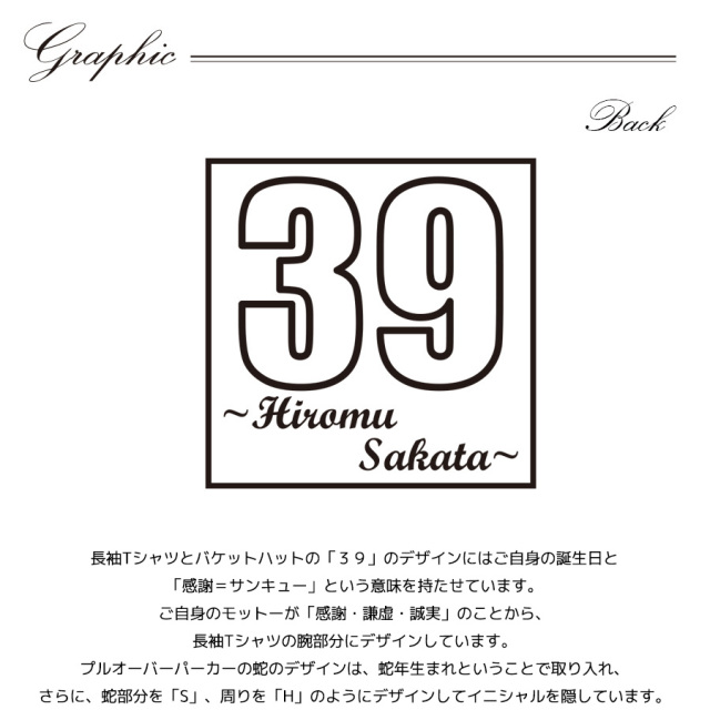 | 商品Data | 坂田大夢さんとのコラボ企画! 今回のコラボは長袖Tシャツ、プルオーバーパーカー、バケットハットをリリース。 【デザイン】 長袖Tシャツとバケットハットの「39」のデザインにはご自身の誕生日と「感謝=サンキュー」という意味を持たせています。 ご自身のモットーが「感謝・謙虚・誠実」のことから、長袖Tシャツの腕部分にデザインしています。 プルオーバーパーカーの蛇のデザインは、蛇年生まれということで取り入れ、 さらに、蛇部分を「S」、周りを「H」のようにデザインしてイニシャルを隠しています。 ここでしか手に入らない受注期間限定アイテムです!是非お買い求めください!!! ※商品の発送予定時期は【3月上旬頃~3月中旬頃順次発送予定】 となります。 ※受注生産の為、発送予定時期が前後する場合がございます。 ※高額注文の場合には ご注文後にお電話にてご連絡をさせていただく場合がございます。 お電話にてご連絡が取れない場合にはメールにてご連絡させていただき、 ご連絡日より3日以内にご返信をいただけない場合には不正注文の可能性があると判断し トラブル防止のためご注文をキャンセルとさせていただきます。 ※商品によっては撮影時にサンプルを使用しているため若干仕様が異なる場合がございます。 また、サイズ・カラーによっては仕様が異なる場合もございます。 ※手作業で縫製をしているため縫製の仕様により、 個体差が生じてしまいますので、1~2cm程度の誤差は予めご了承くださいませ。 ※洗濯機を使用した場合、お届け時のサイズより多少縮む場合がございます。 洗濯機を使用する場合は裏返してネットに入れることを推奨しております。 また、タンブラー乾燥機を使用しますとプリントが剥がれる恐れがありますので 避けていただきますようお願いいたします。 また、洗濯時の液温は40度以下とし、 塩素系および酸素系漂白剤の使用は避けていただきますようお願いいたします。 アイロンにつきましてもプリント及び刺繍部分は避け、 生地部分にアイロンをかける場合にはあて布をして110度(低温)にてお願いいたします。 ※また、受注生産とさせていただいておりますが、 各色・サイズ毎に生産数に限りがございます為、 生産数の上限に達しました場合在庫切れとなる場合がございます。 |