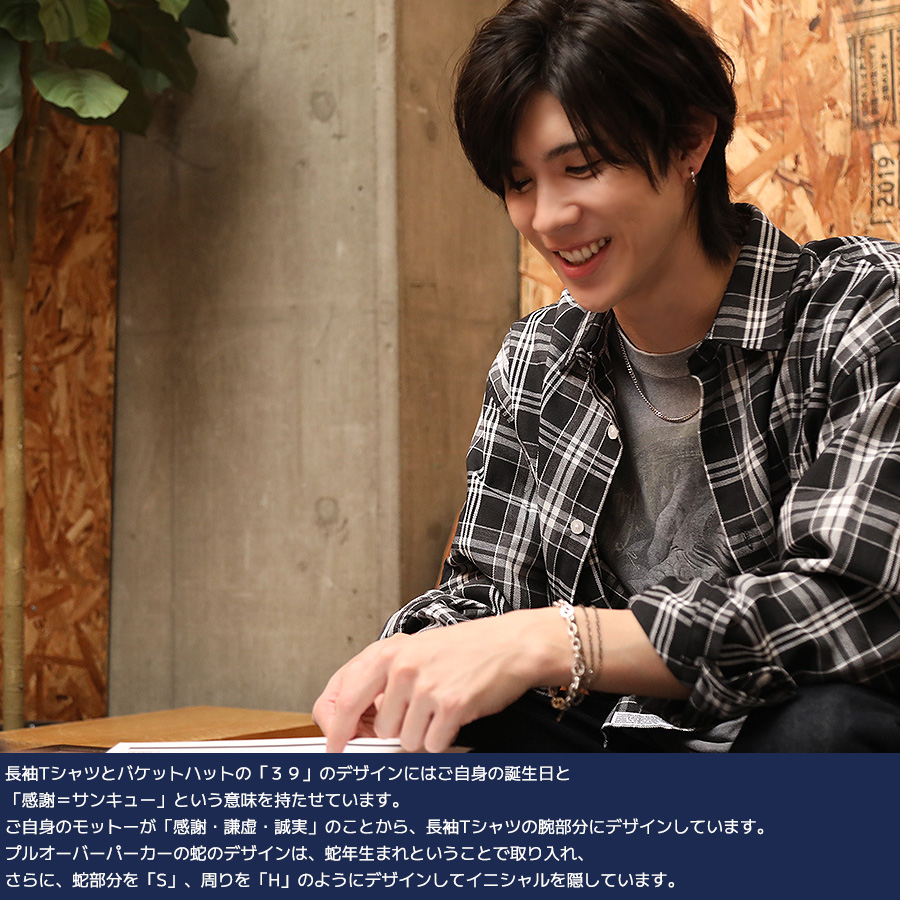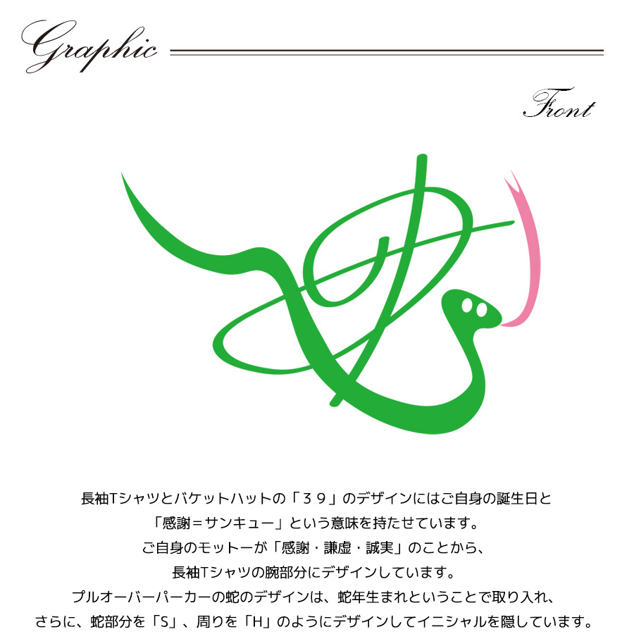 | 商品Data | 坂田大夢さんとのコラボ企画! 今回のコラボは長袖Tシャツ、プルオーバーパーカー、バケットハットをリリース。 【デザイン】 長袖Tシャツとバケットハットの「39」のデザインにはご自身の誕生日と「感謝=サンキュー」という意味を持たせています。 ご自身のモットーが「感謝・謙虚・誠実」のことから、長袖Tシャツの腕部分にデザインしています。 プルオーバーパーカーの蛇のデザインは、蛇年生まれということで取り入れ、 さらに、蛇部分を「S」、周りを「H」のようにデザインしてイニシャルを隠しています。 ここでしか手に入らない受注期間限定アイテムです!是非お買い求めください!!!