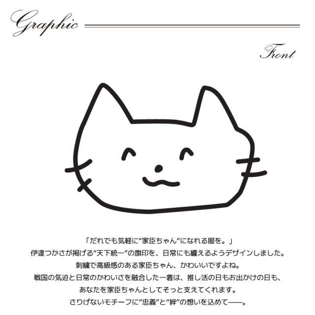 | 商品Data | 伊達つかささんとのコラボ企画! 今回のコラボは半袖Tシャツ、プルオーバーパーカー、スウェットパンツをリリース。 【デザイン】 「だれでも気軽に“家臣ちゃん”になれる服を。」 伊達つかさが掲げる“天下統一”の旗印を、日常にも纏えるようデザインしました。 刺繍で高級感のある家臣ちゃん、かわいいですよね。 戦国の気迫と日常のかわいさを融合した一着は、推し活の日もお出かけの日も、あなたを家臣ちゃん としてそっと支えてくれます。 さりげないモチーフに“忠義”と“絆”の想いを込めて——。 ここでしか手に入らない受注期間限定アイテムです!是非お買い求めください!!! ※商品の発送予定時期は【2月上旬頃〜2月中旬頃順次発送予定】となります。 ※受注生産の為、発送予定時期が前後する場合がございます。 ※高額注文の場合には ご注文後にお電話にてご連絡をさせていただく場合がございます。 お電話にてご連絡が取れない場合にはメールにてご連絡させていただき、 ご連絡日より3日以内にご返信をいただけない場合には不正注文の可能性があると判断し トラブル防止のためご注文をキャンセルとさせていただきます。 ※商品によっては撮影時にサンプルを使用しているため若干仕様が異なる場合がございます。 また、サイズ・カラーによっては仕様が異なる場合もございます。 ※手作業で縫製をしているため縫製の仕様により、 個体差が生じてしまいますので、1~2cm程度の誤差は予めご了承くださいませ。 ※洗濯機を使用した場合、お届け時のサイズより多少縮む場合がございます。 洗濯機を使用する場合は裏返してネットに入れることを推奨しております。 また、タンブラー乾燥機を使用しますとプリントが剥がれる恐れがありますので 避けていただきますようお願いいたします。 また、洗濯時の液温は40度以下とし、 塩素系および酸素系漂白剤の使用は避けていただきますようお願いいたします。 アイロンにつきましてもプリント及び刺繍部分は避け、 生地部分にアイロンをかける場合にはあて布をして110度(低温)にてお願いいたします。 ※また、受注生産とさせていただいておりますが、 各色・サイズ毎に生産数に限りがございます為、 生産数の上限に達しました場合在庫切れとなる場合がございます。 |