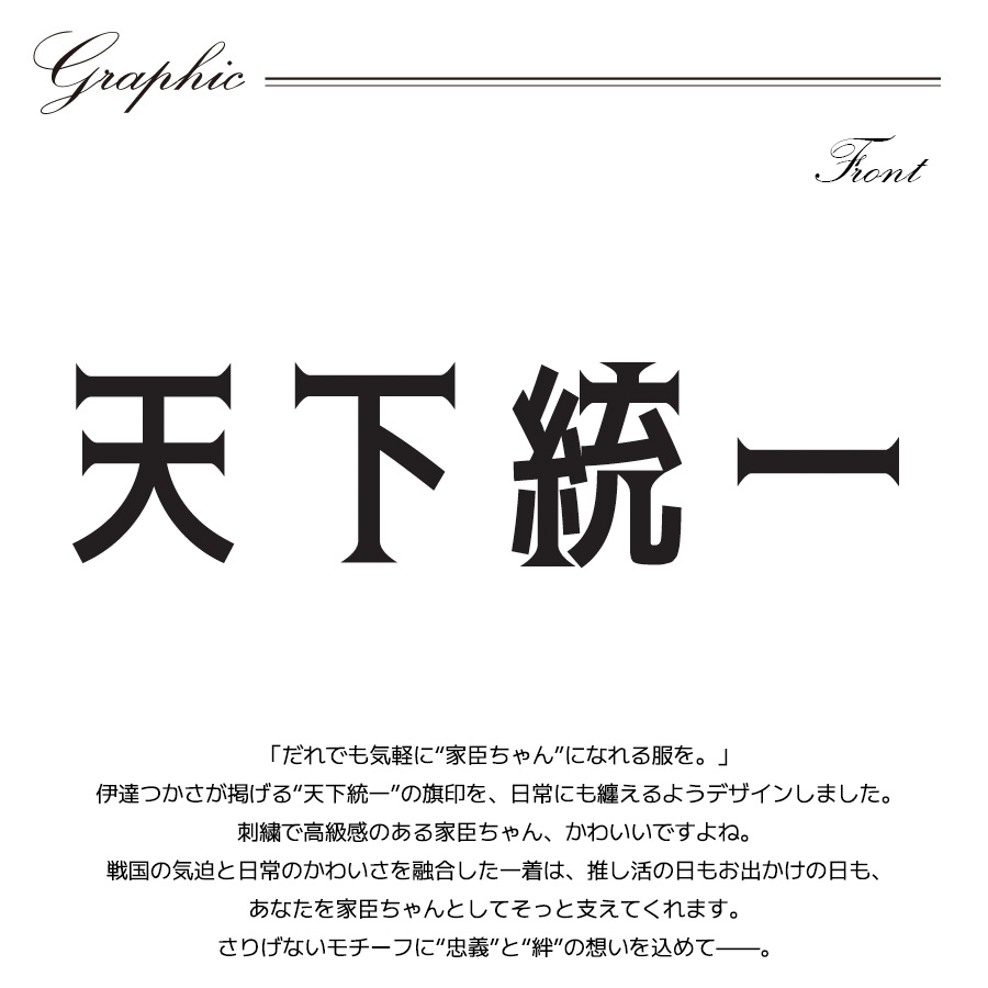 | 商品Data | 伊達つかささんとのコラボ企画! 今回のコラボは半袖Tシャツ、プルオーバーパーカー、スウェットパンツをリリース。 【デザイン】 「だれでも気軽に“家臣ちゃん”になれる服を。」 伊達つかさが掲げる“天下統一”の旗印を、日常にも纏えるようデザインしました。 刺繍で高級感のある家臣ちゃん、かわいいですよね。 戦国の気迫と日常のかわいさを融合した一着は、推し活の日もお出かけの日も、あなたを家臣ちゃん としてそっと支えてくれます。 さりげないモチーフに“忠義”と“絆”の想いを込めて——。 ここでしか手に入らない受注期間限定アイテムです!是非お買い求めください!!! ※商品の発送予定時期は【2月上旬頃〜2月中旬頃順次発送予定】 となります。 ※受注生産の為、発送予定時期が前後する場合がございます。 ※高額注文の場合には ご注文後にお電話にてご連絡をさせていただく場合がございます。 お電話にてご連絡が取れない場合にはメールにてご連絡させていただき、 ご連絡日より3日以内にご返信をいただけない場合には不正注文の可能性があると判断し トラブル防止のためご注文をキャンセルとさせていただきます。 ※商品によっては撮影時にサンプルを使用しているため若干仕様が異なる場合がございます。 また、サイズ・カラーによっては仕様が異なる場合もございます。 ※手作業で縫製をしているため縫製の仕様により、 個体差が生じてしまいますので、1~2cm程度の誤差は予めご了承くださいませ。 ※洗濯機を使用した場合、お届け時のサイズより多少縮む場合がございます。 洗濯機を使用する場合は裏返してネットに入れることを推奨しております。 また、タンブラー乾燥機を使用しますとプリントが剥がれる恐れがありますので 避けていただきますようお願いいたします。 また、洗濯時の液温は40度以下とし、 塩素系および酸素系漂白剤の使用は避けていただきますようお願いいたします。 アイロンにつきましてもプリント及び刺繍部分は避け、 生地部分にアイロンをかける場合にはあて布をして110度(低温)にてお願いいたします。 ※また、受注生産とさせていただいておりますが、 各色・サイズ毎に生産数に限りがございます為、 生産数の上限に達しました場合在庫切れとなる場合がございます。 |