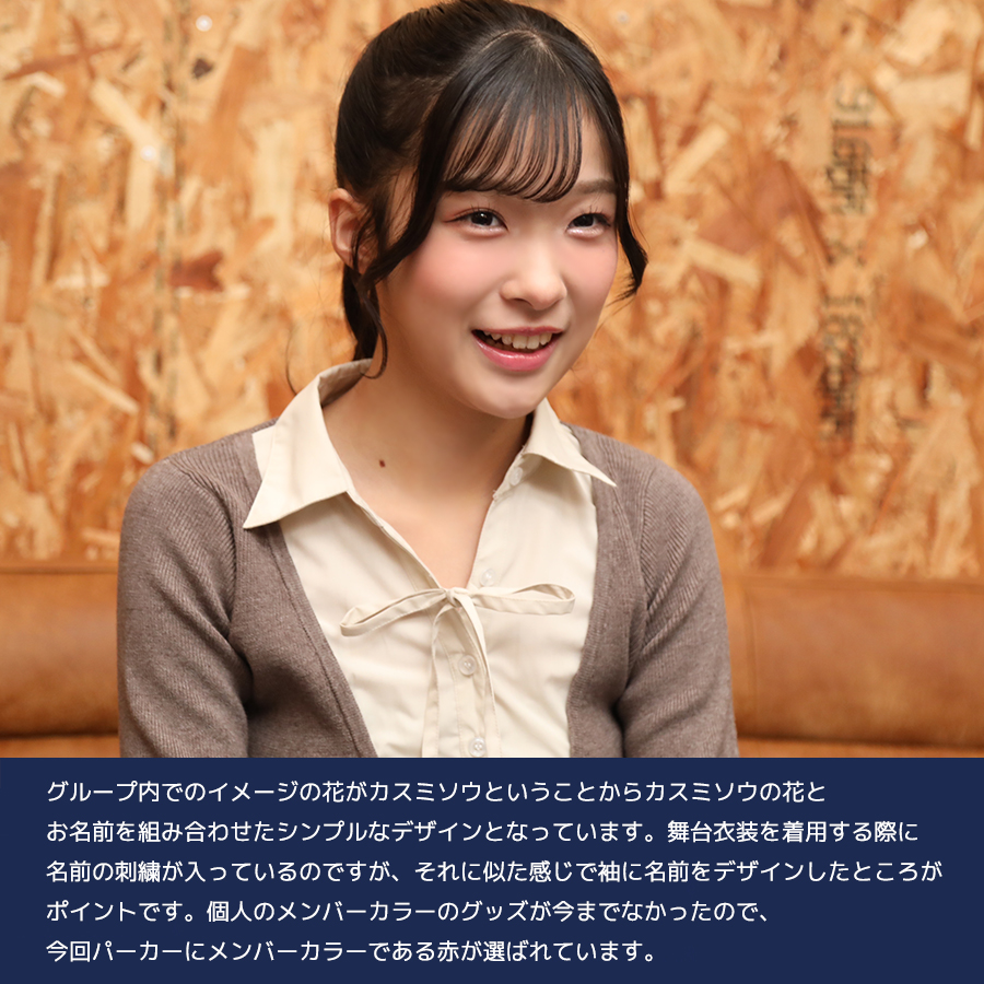 | 商品Data | 千浜もあなさんとのコラボ企画! 今回のコラボは長袖Tシャツ、ZIPパーカー、キャップをリリース。 【デザイン】 グループ内でのイメージの花がカスミソウということからカスミソウの花とお名前を組み合わせたシンプルなデザインとなっています。 舞台衣装を着用する際に名前の刺繍が入っているのですが、それに似た感じで袖に名前をデザインしたところがポイントです。 個人のメンバーカラーのグッズが今までなかったので、今回パーカーにメンバーカラーである赤が選ばれています。 ここでしか手に入らない受注期間限定アイテムです!是非お買い求めください!!! ※商品の発送予定時期は【3月上旬から3月中旬頃順次発送予定】 となります。 ※受注生産の為、発送予定時期が前後する場合がございます。 ※高額注文の場合には ご注文後にお電話にてご連絡をさせていただく場合がございます。 お電話にてご連絡が取れない場合にはメールにてご連絡させていただき、 ご連絡日より3日以内にご返信をいただけない場合には不正注文の可能性があると判断し トラブル防止のためご注文をキャンセルとさせていただきます。 ※商品によっては撮影時にサンプルを使用しているため若干仕様が異なる場合がございます。 また、サイズ・カラーによっては仕様が異なる場合もございます。 ※手作業で縫製をしているため縫製の仕様により、 個体差が生じてしまいますので、1~2cm程度の誤差は予めご了承くださいませ。 ※洗濯機を使用した場合、お届け時のサイズより多少縮む場合がございます。 洗濯機を使用する場合は裏返してネットに入れることを推奨しております。 また、タンブラー乾燥機を使用しますとプリントが剥がれる恐れがありますので 避けていただきますようお願いいたします。 また、洗濯時の液温は40度以下とし、 塩素系および酸素系漂白剤の使用は避けていただきますようお願いいたします。 アイロンにつきましてもプリント及び刺繍部分は避け、 生地部分にアイロンをかける場合にはあて布をして110度(低温)にてお願いいたします。 ※また、受注生産とさせていただいておりますが、 各色・サイズ毎に生産数に限りがございます為、 生産数の上限に達しました場合在庫切れとなる場合がございます。 |