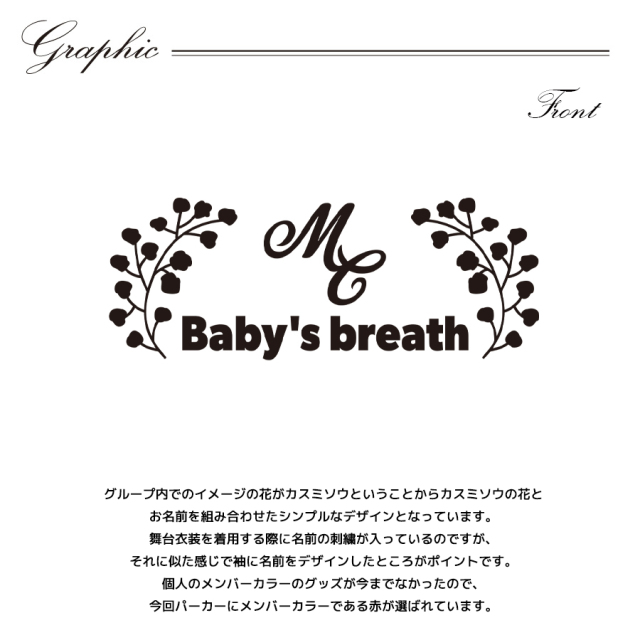| 商品Data | 千浜もあなさんとのコラボ企画! 今回のコラボは長袖Tシャツ、ZIPパーカー、キャップをリリース。 【デザイン】 グループ内でのイメージの花がカスミソウということからカスミソウの花とお名前を組み合わせたシンプルなデザインとなっています。 舞台衣装を着用する際に名前の刺繍が入っているのですが、それに似た感じで袖に名前をデザインしたところがポイントです。 個人のメンバーカラーのグッズが今までなかったので、今回パーカーにメンバーカラーである赤が選ばれています。 ここでしか手に入らない受注期間限定アイテムです!是非お買い求めください!!!
