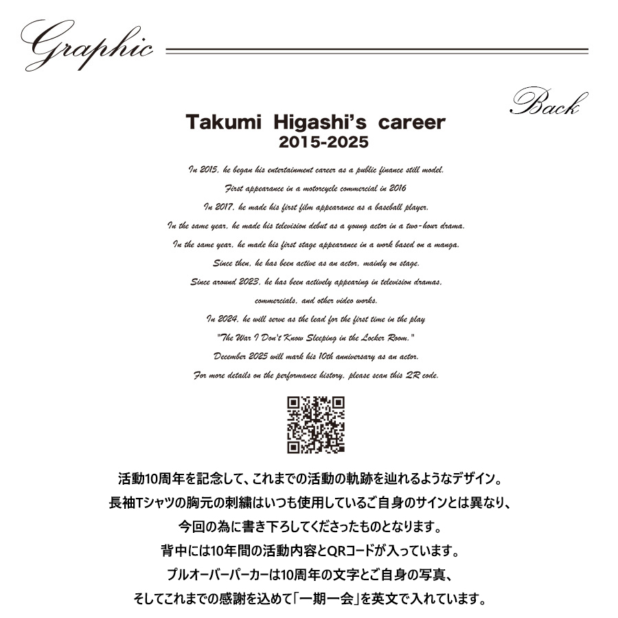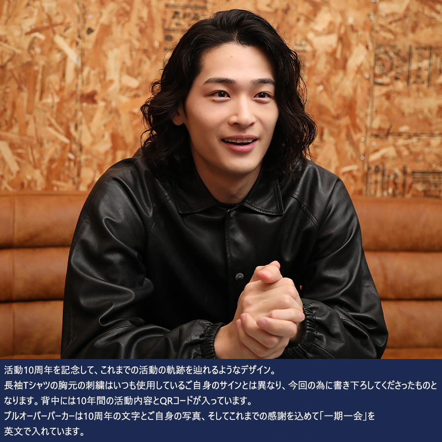 | 商品Data | 東拓海さんとのコラボ企画! 今回のコラボは長袖Tシャツ、プルオーバーパーカー、ネックレスをリリース。 【デザイン】 活動10周年を記念して、これまでの活動の軌跡を辿れるようなデザイン。 長袖Tシャツの胸元の刺繍はいつも使用しているご自身のサインとは異なり、 今回の為に書き下ろしてくださったものとなります。 背中には10年間の活動内容とQRコードが入っています。 プルオーバーパーカーは10周年の文字とご自身の写真、 そしてこれまでの感謝を込めて「一期一会」を英文で入れています。 ここでしか手に入らない受注期間限定アイテムです!是非お買い求めください!!! ※商品の発送予定時期は【2月下旬頃~3月上旬頃順次発送予定】 となります。 ※受注生産の為、発送予定時期が前後する場合がございます。 ※高額注文の場合には ご注文後にお電話にてご連絡をさせていただく場合がございます。 お電話にてご連絡が取れない場合にはメールにてご連絡させていただき、 ご連絡日より3日以内にご返信をいただけない場合には不正注文の可能性があると判断し トラブル防止のためご注文をキャンセルとさせていただきます。 ※商品によっては撮影時にサンプルを使用しているため若干仕様が異なる場合がございます。 また、サイズ・カラーによっては仕様が異なる場合もございます。 ※手作業で縫製をしているため縫製の仕様により、 個体差が生じてしまいますので、1~2cm程度の誤差は予めご了承くださいませ。 ※洗濯機を使用した場合、お届け時のサイズより多少縮む場合がございます。 洗濯機を使用する場合は裏返してネットに入れることを推奨しております。 また、タンブラー乾燥機を使用しますとプリントが剥がれる恐れがありますので 避けていただきますようお願いいたします。 また、洗濯時の液温は40度以下とし、 塩素系および酸素系漂白剤の使用は避けていただきますようお願いいたします。 アイロンにつきましてもプリント及び刺繍部分は避け、 生地部分にアイロンをかける場合にはあて布をして110度(低温)にてお願いいたします。 ※また、受注生産とさせていただいておりますが、 各色・サイズ毎に生産数に限りがございます為、 生産数の上限に達しました場合在庫切れとなる場合がございます。 |