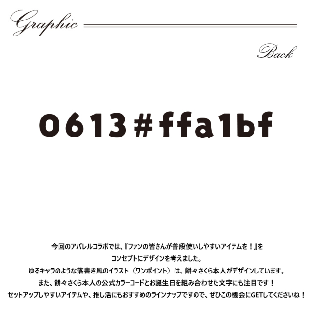 | 商品Data | 餅々さくらさんとのコラボ企画! 今回のコラボはトレーナー、スウェットパンツ、トートバッグ、ブレスレットをリリース。 【デザイン】 今回のアパレルコラボでは、 『ファンの皆さんが普段使いしやすいアイテムを!』をコンセプトにデザインを考えました。 ゆるキャラのような落書き風のイラスト(ワンポイント)は、餅々さくら本人がデザインしています。 また、餅々さくら本人の公式カラーコードとお誕生日を組み合わせた文字にも注目です! セットアップしやすいアイテムや、推し活にもおすすめのラインナップですので、 ぜひこの機会にGETしてくださいね! ※商品の発送予定時期は 【2月中旬頃〜2月下旬頃順次発送予定】 となります。 ※受注生産の為、発送予定時期が前後する場合がございます。 ※高額注文の場合には ご注文後にお電話にてご連絡をさせていただく場合がございます。 お電話にてご連絡が取れない場合にはメールにてご連絡させていただき、 ご連絡日より3日以内にご返信をいただけない場合には不正注文の可能性があると判断し トラブル防止のためご注文をキャンセルとさせていただきます。 ※商品によっては撮影時にサンプルを使用しているため若干仕様が異なる場合がございます。 また、サイズ・カラーによっては仕様が異なる場合もございます。 ※手作業で縫製をしているため縫製の仕様により、 個体差が生じてしまいますので、1~2cm程度の誤差は予めご了承くださいませ。 ※洗濯機を使用した場合、お届け時のサイズより多少縮む場合がございます。 洗濯機を使用する場合は裏返してネットに入れることを推奨しております。 また、タンブラー乾燥機を使用しますとプリントが剥がれる恐れがありますので 避けていただきますようお願いいたします。 また、洗濯時の液温は40度以下とし、 塩素系および酸素系漂白剤の使用は避けていただきますようお願いいたします。 アイロンにつきましてもプリント及び刺繍部分は避け、 生地部分にアイロンをかける場合にはあて布をして110度(低温)にてお願いいたします。 ※また、受注生産とさせていただいておりますが、 各色・サイズ毎に生産数に限りがございます為、 生産数の上限に達しました場合在庫切れとなる場合がございます。 |