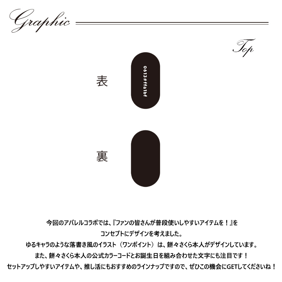 ※メンズ・レディースモデル着用画像はコンポジットイメージとなります。 餅々さくらさんとのコラボ企画! 今回のコラボはトレーナー、スウェットパンツ、トートバッグ、ブレスレットをリリース。 【デザイン】 今回のアパレルコラボでは、 『ファンの皆さんが普段使いしやすいアイテムを!』をコンセプトにデザインを考えました。 ゆるキャラのような落書き風のイラスト(ワンポイント)は、餅々さくら本人がデザインしています。 また、餅々さくら本人の公式カラーコードとお誕生日を組み合わせた文字にも注目です! セットアップしやすいアイテムや、推し活にもおすすめのラインナップですので、 ぜひこの機会にGETしてくださいね! メッキ加工:国内加工 原型作成:国内 ※アレルギーの反応等がその時の体調や個人差により出る場合がございますので、 金属製アクセサリーを初めてご使用の場合は必ず「パッチテスト」をしてご使用ください。※ 【パッチテストとは】 金属アレルギーの場合、特殊なテープに24種類の金属試薬をつけてアレルギーの有無を調べる検査です。 皮膚科などで相談をすれば身近にできる検査です。 いくつか検査中に注意する点がありますのでテストを受ける病院で検査について相談してください。 ※現時点での商品の発送予定時期は 【2月中旬頃〜2月下旬頃順次発送】 を予定しております。 ※受注生産の為、発送予定時期が前後する場合がございます。 ※高額注文の場合には ご注文後にお電話にてご連絡をさせていただく場合がございます。 お電話にてご連絡が取れない場合にはメールにてご連絡させていただき、 ご連絡日より3日以内にご返信をいただけない場合には不正注文の可能性があると判断し トラブル防止のためご注文をキャンセルとさせていただきます。 また、受注生産とさせていただいておりますが、 各色・サイズ毎に生産数を設けさせて頂いております為、 生産数の上限に達しました場合在庫切れとなる場合がございます。 ※※商品画像は照明などの影響により実際の色と異なる場合がございます ※加工の特性上、仕上がり寸法及び色のニュアンスが多少異なることがあります。 |