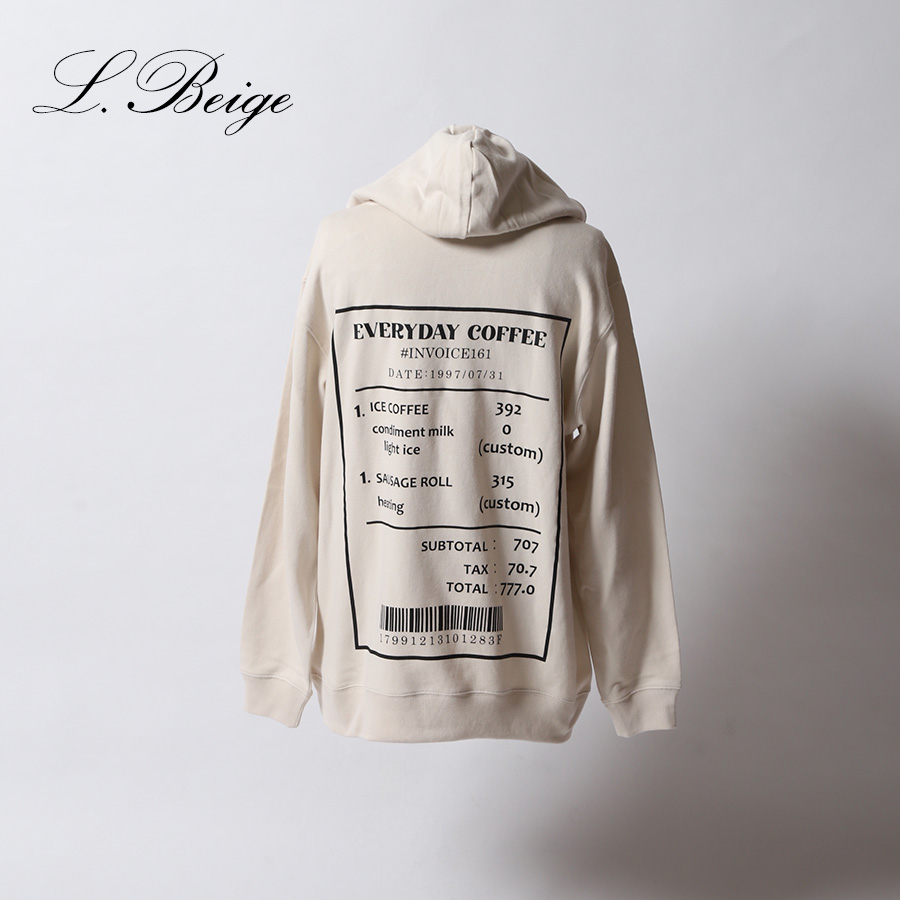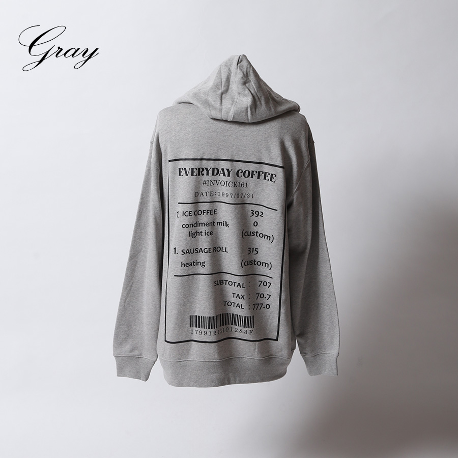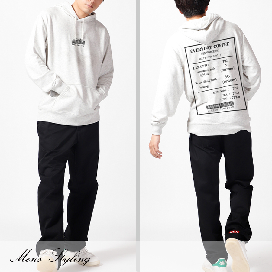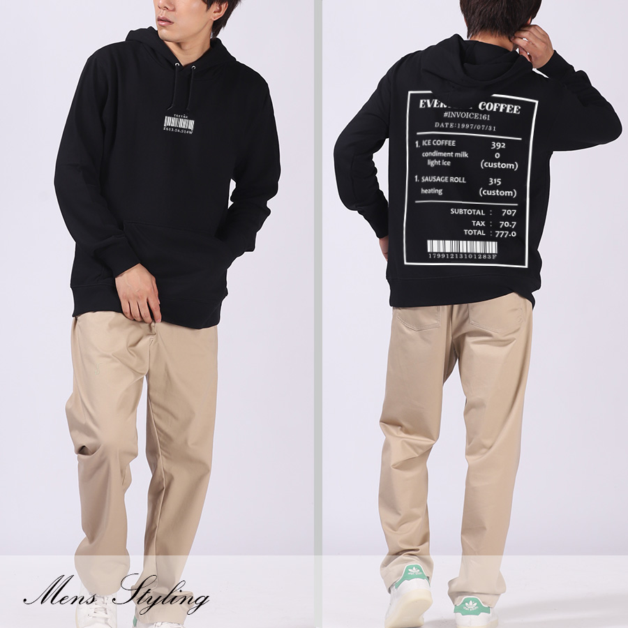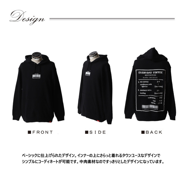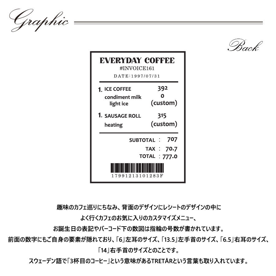 | 商品Data | 緒方佑奈さんとのコラボ企画! 今回のコラボは半袖Tシャツ、MA-1、プルオーバーパーカー、ネックレスをリリース。 【デザイン】 趣味のカフェ巡りにちなみ、背面のデザインにレシートのデザインの中に よく行くカフェのお気に入りのカスタマイズメニュー、 お誕生日の表記やバーコード下の数図は指輪の号数が書かれています。 前面の数字にもご自身の要素が隠れており、「6」左耳のサイズ、「13.5」左手首のサイズ、 「6.5」右耳のサイズ、「14」右手首のサイズとのことです。 スウェーデン語で「3杯目のコーヒー」という意味があるTRETÅRという言葉も取り入れています。 ここでしか手に入らない受注期間限定アイテムです!是非お買い求めください!!!
