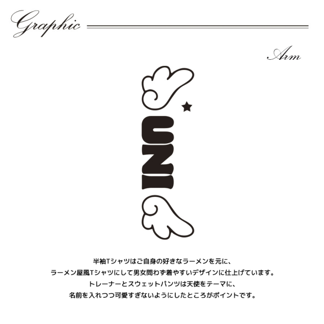 | 商品Data | 雲丹うにさんとのコラボ企画第2弾! 今回のコラボは半袖Tシャツ、トレーナー、スウェットパンツをリリース。 【デザイン】 半袖Tシャツはご自身の好きなラーメンを元に、ラーメン屋風Tシャツにして男女問わず着やすいデザインに仕上げています。 トレーナーとスウェットパンツは天使をテーマに、名前を入れつつ可愛すぎないようにしたところがポイントです。 ここでしか手に入らない受注期間限定アイテムです!是非お買い求めください!!! ※商品の発送予定時期は【3月中旬頃~3月下旬頃順次発送予定】 となります。 ※受注生産の為、発送予定時期が前後する場合がございます。 ※高額注文の場合には ご注文後にお電話にてご連絡をさせていただく場合がございます。 お電話にてご連絡が取れない場合にはメールにてご連絡させていただき、 ご連絡日より3日以内にご返信をいただけない場合には不正注文の可能性があると判断し トラブル防止のためご注文をキャンセルとさせていただきます。 ※商品によっては撮影時にサンプルを使用しているため若干仕様が異なる場合がございます。 また、サイズ・カラーによっては仕様が異なる場合もございます。 ※手作業で縫製をしているため縫製の仕様により、 個体差が生じてしまいますので、1~2cm程度の誤差は予めご了承くださいませ。 ※洗濯機を使用した場合、お届け時のサイズより多少縮む場合がございます。 洗濯機を使用する場合は裏返してネットに入れることを推奨しております。 また、タンブラー乾燥機を使用しますとプリントが剥がれる恐れがありますので 避けていただきますようお願いいたします。 また、洗濯時の液温は40度以下とし、 塩素系および酸素系漂白剤の使用は避けていただきますようお願いいたします。 アイロンにつきましてもプリント及び刺繍部分は避け、 生地部分にアイロンをかける場合にはあて布をして110度(低温)にてお願いいたします。 ※また、受注生産とさせていただいておりますが、 各色・サイズ毎に生産数に限りがございます為、 生産数の上限に達しました場合在庫切れとなる場合がございます。 |