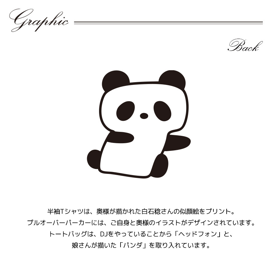 | 商品Data | 白石稔さんとのコラボ企画! 今回のコラボは半袖Tシャツ、プルオーバーパーカー、トートバッグをリリース。 【デザイン】 半袖Tシャツは、奥様が描かれた白石稔さんの似顔絵をプリント。 プルオーバーパーカーには、ご自身と奥様のイラストがデザインされています。 トートバッグは、DJをやっていることから「ヘッドフォン」と、娘さんが描いた「パンダ」を取り入れています。 ここでしか手に入らない受注期間限定アイテムです!是非お買い求めください!!! ※商品の発送予定時期は 【2月下旬頃~3月上旬頃順次発送予定】となります。 ※受注生産の為、発送予定時期が前後する場合がございます。 ※高額注文の場合には ご注文後にお電話にてご連絡をさせていただく場合がございます。 お電話にてご連絡が取れない場合にはメールにてご連絡させていただき、 ご連絡日より3日以内にご返信をいただけない場合には不正注文の可能性があると判断し トラブル防止のためご注文をキャンセルとさせていただきます。 ※商品によっては撮影時にサンプルを使用しているため若干仕様が異なる場合がございます。 また、サイズ・カラーによっては仕様が異なる場合もございます。 ※手作業で縫製をしているため縫製の仕様により、 個体差が生じてしまいますので、1~2cm程度の誤差は予めご了承くださいませ。 ※洗濯機を使用した場合、お届け時のサイズより多少縮む場合がございます。 洗濯機を使用する場合は裏返してネットに入れることを推奨しております。 また、タンブラー乾燥機を使用しますとプリントが剥がれる恐れがありますので 避けていただきますようお願いいたします。 また、洗濯時の液温は40度以下とし、 塩素系および酸素系漂白剤の使用は避けていただきますようお願いいたします。 アイロンにつきましてもプリント及び刺繍部分は避け、 生地部分にアイロンをかける場合にはあて布をして110度(低温)にてお願いいたします。 ※また、受注生産とさせていただいておりますが、 各色・サイズ毎に生産数に限りがございます為、 生産数の上限に達しました場合在庫切れとなる場合がございます。 |