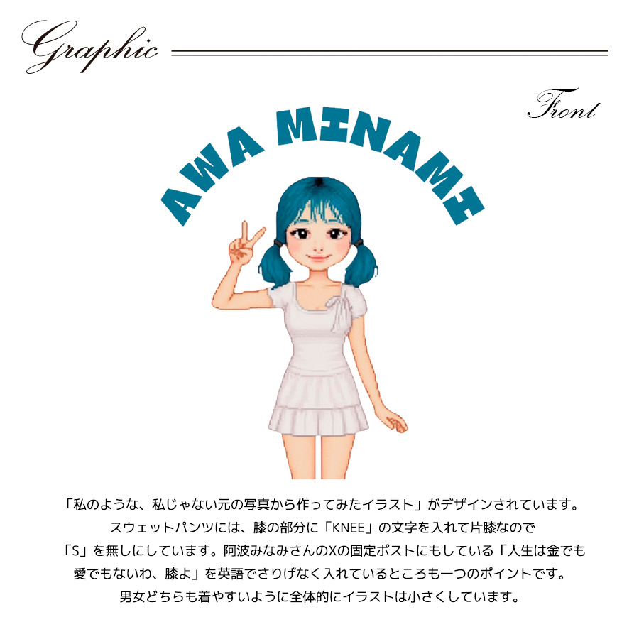 | 商品Data | 阿波みなみさんとのコラボ企画! 今回のコラボはトレーナー、ZIPパーカー、スウェットパンツ、トートバッグをリリース。 【デザイン】 「私のような、私じゃない元の写真から作ってみたイラスト」がデザインされています。 スウェットパンツには、膝の部分に「KNEE」の文字を入れて片膝なので「S」を無しにしています。 阿波みなみさんのXの固定ポストにもしている「人生は金でも愛でもないわ、膝よ」を英語でさりげな く入れているところも一つのポイントです。 男女どちらも着やすいように全体的にイラストは小さくしています。 ここでしか手に入らない受注期間限定アイテムです!是非お買い求めください!!! ※商品の発送予定時期は 【3月上旬頃~3月中旬頃順次発送予定】 となります。 ※受注生産の為、発送予定時期が前後する場合がございます。 ※高額注文の場合には ご注文後にお電話にてご連絡をさせていただく場合がございます。 お電話にてご連絡が取れない場合にはメールにてご連絡させていただき、 ご連絡日より3日以内にご返信をいただけない場合には不正注文の可能性があると判断し トラブル防止のためご注文をキャンセルとさせていただきます。 ※商品によっては撮影時にサンプルを使用しているため若干仕様が異なる場合がございます。 また、サイズ・カラーによっては仕様が異なる場合もございます。 ※手作業で縫製をしているため縫製の仕様により、 個体差が生じてしまいますので、1~2cm程度の誤差は予めご了承くださいませ。 ※洗濯機を使用した場合、お届け時のサイズより多少縮む場合がございます。 洗濯機を使用する場合は裏返してネットに入れることを推奨しております。 また、タンブラー乾燥機を使用しますとプリントが剥がれる恐れがありますので 避けていただきますようお願いいたします。 また、洗濯時の液温は40度以下とし、 塩素系および酸素系漂白剤の使用は避けていただきますようお願いいたします。 アイロンにつきましてもプリント及び刺繍部分は避け、 生地部分にアイロンをかける場合にはあて布をして110度(低温)にてお願いいたします。 ※また、受注生産とさせていただいておりますが、 各色・サイズ毎に生産数に限りがございます為、 生産数の上限に達しました場合在庫切れとなる場合がございます。 |
