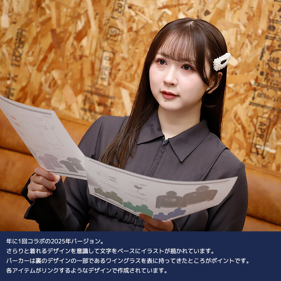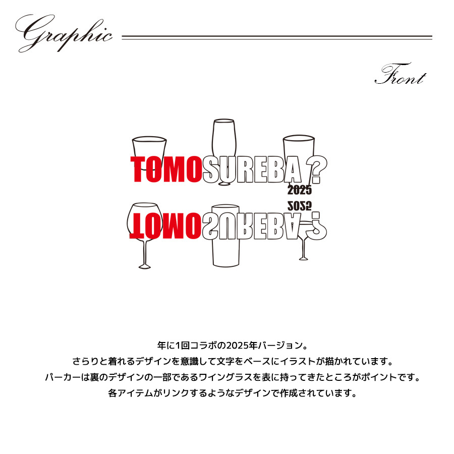 | 商品Data | トモすれば・・・!?とのコラボ企画第4弾! 今回のコラボは半袖Tシャツ、プルオーバーパーカー、クッションをリリース。 【デザイン】 年に1回コラボの2025年バージョン。 さらりと着れるデザインを意識して文字をベースにイラストが描かれています。 パーカーは裏のデザインの一部であるワイングラスを表に持ってきたところがポイントです。 各アイテムがリンクするようなデザインで作成されています。 ここでしか手に入らない受注期間限定アイテムです!是非お買い求めください!!! ※商品の発送予定時期は【3月下旬頃〜4月上旬頃順次発送予定】 となります。 ※受注生産の為、発送予定時期が前後する場合がございます。 ※高額注文の場合には ご注文後にお電話にてご連絡をさせていただく場合がございます。 お電話にてご連絡が取れない場合にはメールにてご連絡させていただき、 ご連絡日より3日以内にご返信をいただけない場合には不正注文の可能性があると判断し トラブル防止のためご注文をキャンセルとさせていただきます。 ※商品によっては撮影時にサンプルを使用しているため若干仕様が異なる場合がございます。 また、サイズ・カラーによっては仕様が異なる場合もございます。 ※手作業で縫製をしているため縫製の仕様により、 個体差が生じてしまいますので、1~2cm程度の誤差は予めご了承くださいませ。 ※洗濯機を使用した場合、お届け時のサイズより多少縮む場合がございます。 洗濯機を使用する場合は裏返してネットに入れることを推奨しております。 また、タンブラー乾燥機を使用しますとプリントが剥がれる恐れがありますので 避けていただきますようお願いいたします。 また、洗濯時の液温は40度以下とし、 塩素系および酸素系漂白剤の使用は避けていただきますようお願いいたします。 アイロンにつきましてもプリント及び刺繍部分は避け、 生地部分にアイロンをかける場合にはあて布をして110度(低温)にてお願いいたします。 ※また、受注生産とさせていただいておりますが、 各色・サイズ毎に生産数に限りがございます為、 生産数の上限に達しました場合在庫切れとなる場合がございます。 |