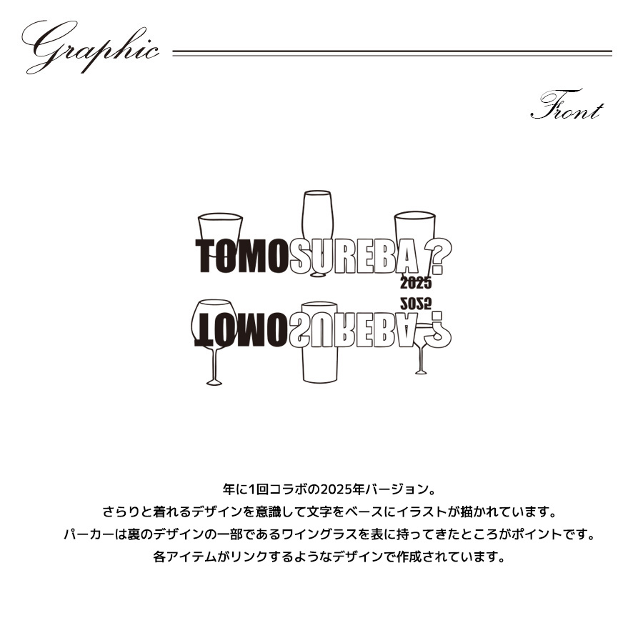 トモすれば・・・!?とのコラボ企画第4弾! 今回のコラボは半袖Tシャツ、プルオーバーパーカー、クッションをリリース。 【デザイン】 年に1回コラボの2025年バージョン。 さらりと着れるデザインを意識して文字をベースにイラストが描かれています。 パーカーは裏のデザインの一部であるワイングラスを表に持ってきたところがポイントです。 各アイテムがリンクするようなデザインで作成されています。 ここでしか手に入らない受注期間限定アイテムです!是非お買い求めください!!! ※商品の発送予定時期は【3月下旬頃〜4月上旬頃順次発送予定】 となります。 ※受注生産の為、発送予定時期が前後する場合がございます。 ※高額注文の場合にはご注文後にお電話にてご連絡をさせていただく場合がございます。 お電話にてご連絡が取れない場合にはメールにてご連絡させていただき、 ご連絡日より3日以内にご返信をいただけない場合には不正注文の可能性があると判断し トラブル防止のためご注文をキャンセルとさせていただきます。 ※商品によっては撮影時にサンプルを使用しているため若干デザインや仕様が異なる場合がございます。 また、サイズ・カラーによっては仕様が異なる場合もございます。 ※手作業で縫製をしているため縫製の仕様により、 個体差が生じてしまいますので、1~2cm程度の誤差は予めご了承くださいませ。 ※洗濯機を使用した場合、お届け時のサイズより多少縮む場合がございます。 洗濯機を使用する場合は裏返してネットに入れることを推奨しております。 また、タンブラー乾燥機を使用しますとプリントが剥がれる恐れがありますので 避けていただきますようお願いいたします。 また、洗濯時の液温は40度以下とし、 塩素系および酸素系漂白剤の使用は避けていただきますようお願いいたします。 アイロンにつきましてもプリント及び刺繍部分は避け、 生地部分にアイロンをかける場合にはあて布をして110度(低温)にてお願いいたします。 ※また、受注生産とさせていただいておりますが、 各色・サイズ毎に生産数に限りがございます為、 生産数の上限に達しました場合在庫切れとなる場合がございます。 |