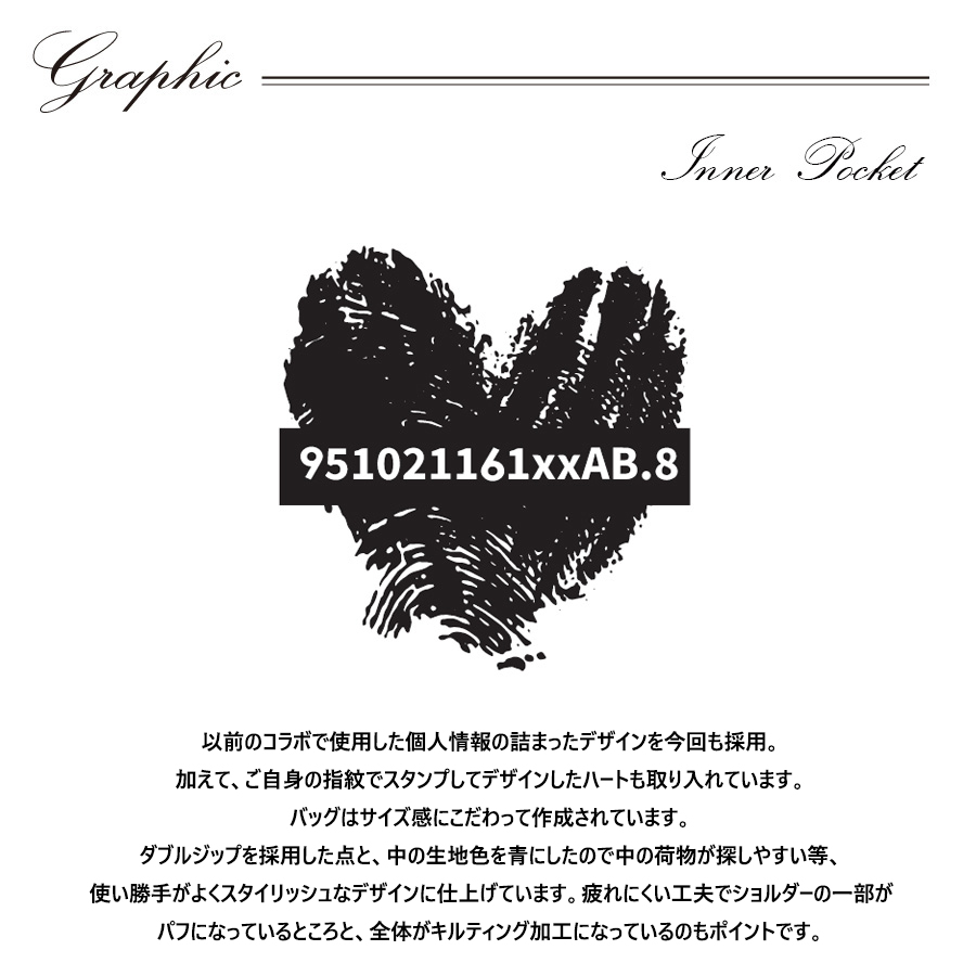 | 商品Data | 黒木ほの香さんとのコラボ企画第5弾! 今回のコラボはポロシャツ、ZIPパーカー、BAGをリリース。 【デザイン】 以前のコラボで使用した個人情報の詰まったデザインを今回も採用。 加えて、ご自身の指紋でスタンプしてデザインしたハートも取り入れています。 バッグはサイズ感にこだわって作成されています。 ダブルジップを採用した点と、中の生地色を青にしたので中の荷物が探しやすい等、 使い勝手がよくスタイリッシュなデザインに仕上げています。 疲れにくい工夫でショルダーの一部がパフになっているところと、 全体がキルティング加工になっているのもポイントです。 ここでしか手に入らない受注期間限定アイテムです!是非お買い求めください!!! ※商品の発送予定時期は 【5月中旬頃~6月上旬頃順次発送予定】となります。 となります。 ※受注生産の為、発送予定時期が前後する場合がございます。 ※高額注文の場合には ご注文後にお電話にてご連絡をさせていただく場合がございます。 お電話にてご連絡が取れない場合にはメールにてご連絡させていただき、 ご連絡日より3日以内にご返信をいただけない場合には不正注文の可能性があると判断し トラブル防止のためご注文をキャンセルとさせていただきます。 ※商品によっては撮影時にサンプルを使用しているため若干仕様が異なる場合がございます。 また、サイズ・カラーによっては仕様が異なる場合もございます。 ※手作業で縫製をしているため縫製の仕様により、 個体差が生じてしまいますので、1~2cm程度の誤差は予めご了承くださいませ。 ※洗濯機を使用した場合、お届け時のサイズより多少縮む場合がございます。 洗濯機を使用する場合は裏返してネットに入れることを推奨しております。 また、タンブラー乾燥機を使用しますとプリントが剥がれる恐れがありますので 避けていただきますようお願いいたします。 また、洗濯時の液温は40度以下とし、 塩素系および酸素系漂白剤の使用は避けていただきますようお願いいたします。 アイロンにつきましてもプリント及び刺繍部分は避け、 生地部分にアイロンをかける場合にはあて布をして110度(低温)にてお願いいたします。 ※また、受注生産とさせていただいておりますが、 各色・サイズ毎に生産数に限りがございます為、 生産数の上限に達しました場合在庫切れとなる場合がございます。 |
