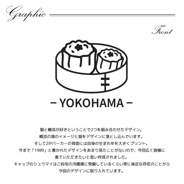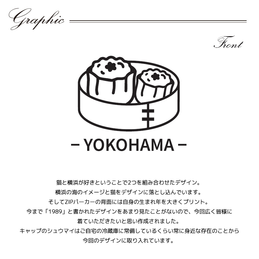 | 商品Data | 倉持明日香さんとのコラボ企画! 今回のコラボは半袖Tシャツ、ZIPパーカー、キャップをリリース。 【デザイン】 猫と横浜が好きということで2つを組み合わせたデザイン。 横浜の海のイメージと猫をデザインに落とし込んでいます。 そしてZIPパーカーの背面には自身の生まれ年を大きくプリント。 今まで「1989」と書かれたデザインをあまり見たことがないので、 今回広く皆様に着ていただきたいと思い作成されました。 キャップのシュウマイはご自宅の冷蔵庫に常備しているくらい 常に身近な存在のことから今回のデザインに取り入れています。 ここでしか手に入らない受注期間限定アイテムです!是非お買い求めください!!!