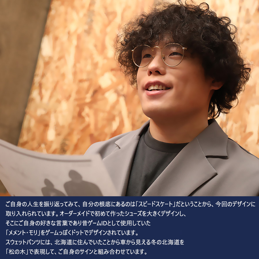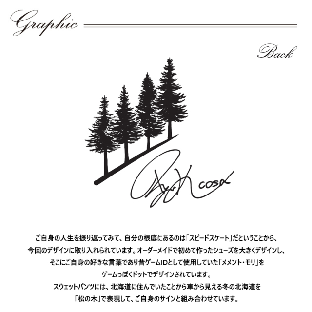 | 商品Data | cosaさんとのコラボ企画! 今回のコラボは半袖Tシャツ、プルオーバーパーカー、スウェットパンツをリリース。 【デザイン】 ご自身の人生を振り返ってみて、自分の根底にあるのは「スピードスケート」だということから、 今回のデザインに取り入れられています。 オーダーメイドで初めて作ったシューズを大きくデザインし、 そこにご自身の好きな言葉であり昔ゲームIDとして使用していた「メメント・モリ」を ゲームっぽくドットでデザインされています。 スウェットパンツには、北海道に住んでいたことから車から見える冬の北海道を 「松の木」で表現して、ご自身のサインと組み合わせています。 ここでしか手に入らない受注期間限定アイテムです!是非お買い求めください!!! ※商品の発送予定時期は【4月上旬頃~4月中旬頃順次発送予定】 となります。 ※受注生産の為、発送予定時期が前後する場合がございます。 ※高額注文の場合には ご注文後にお電話にてご連絡をさせていただく場合がございます。 お電話にてご連絡が取れない場合にはメールにてご連絡させていただき、 ご連絡日より3日以内にご返信をいただけない場合には不正注文の可能性があると判断し トラブル防止のためご注文をキャンセルとさせていただきます。 ※商品によっては撮影時にサンプルを使用しているため若干仕様が異なる場合がございます。 また、サイズ・カラーによっては仕様が異なる場合もございます。 ※手作業で縫製をしているため縫製の仕様により、 個体差が生じてしまいますので、1~2cm程度の誤差は予めご了承くださいませ。 ※洗濯機を使用した場合、お届け時のサイズより多少縮む場合がございます。 洗濯機を使用する場合は裏返してネットに入れることを推奨しております。 また、タンブラー乾燥機を使用しますとプリントが剥がれる恐れがありますので 避けていただきますようお願いいたします。 また、洗濯時の液温は40度以下とし、 塩素系および酸素系漂白剤の使用は避けていただきますようお願いいたします。 アイロンにつきましてもプリント及び刺繍部分は避け、 生地部分にアイロンをかける場合にはあて布をして110度(低温)にてお願いいたします。 ※また、受注生産とさせていただいておりますが、 各色・サイズ毎に生産数に限りがございます為、 生産数の上限に達しました場合在庫切れとなる場合がございます。 |