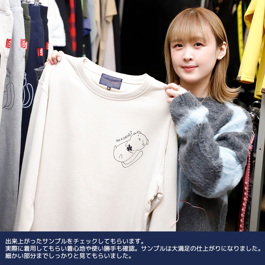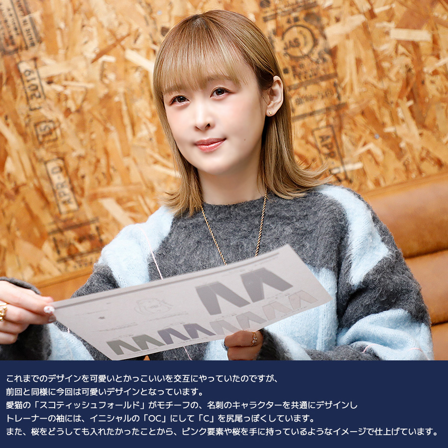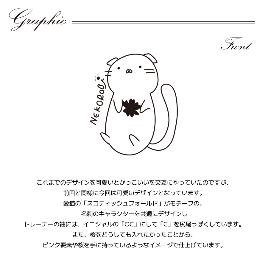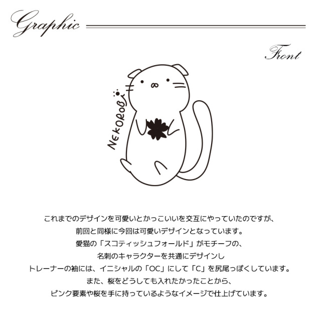 | 商品Data | 桜咲千依さんとのコラボ企画第9弾! 今回のコラボはトレーナー、スウェットパンツをリリース。 【デザイン】 これまでのデザインを可愛いとかっこいいを交互にやっていたのですが、 前回と同様に今回は可愛いデザインとなっています。 愛猫の「スコティッシュフォールド」がモチーフの、 名刺のキャラクターを共通にデザインし トレーナーの袖には、イニシャルの「OC」にして「C」を尻尾っぽくしています。 また、桜をどうしても入れたかったことから、 ピンク要素や桜を手に持っているようなイメージで仕上げています。 ここでしか手に入らない受注期間限定アイテムです!是非お買い求めください!!! ※商品の発送予定時期は【4月下旬頃~5月上旬頃順次発送予定】 となります。 ※受注生産の為、発送予定時期が前後する場合がございます。 ※高額注文の場合には ご注文後にお電話にてご連絡をさせていただく場合がございます。 お電話にてご連絡が取れない場合にはメールにてご連絡させていただき、 ご連絡日より3日以内にご返信をいただけない場合には不正注文の可能性があると判断し トラブル防止のためご注文をキャンセルとさせていただきます。 ※商品によっては撮影時にサンプルを使用しているため若干仕様が異なる場合がございます。 また、サイズ・カラーによっては仕様が異なる場合もございます。 ※手作業で縫製をしているため縫製の仕様により、 個体差が生じてしまいますので、1~2cm程度の誤差は予めご了承くださいませ。 ※洗濯機を使用した場合、お届け時のサイズより多少縮む場合がございます。 洗濯機を使用する場合は裏返してネットに入れることを推奨しております。 また、タンブラー乾燥機を使用しますとプリントが剥がれる恐れがありますので 避けていただきますようお願いいたします。 また、洗濯時の液温は40度以下とし、 塩素系および酸素系漂白剤の使用は避けていただきますようお願いいたします。 アイロンにつきましてもプリント及び刺繍部分は避け、 生地部分にアイロンをかける場合にはあて布をして110度(低温)にてお願いいたします。 ※また、受注生産とさせていただいておりますが、 各色・サイズ毎に生産数に限りがございます為、 生産数の上限に達しました場合在庫切れとなる場合がございます。 |