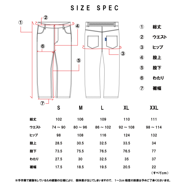 【ユニセックスサイズ】 S■総丈102cm,ウエスト74~90cm,ヒップ98cm,股上28.5cm,股下73.5cm,わたり幅27.5cm,裾幅17.5cm M■総丈106cm,ウエスト80~96cm,ヒップ108cm,股上30.5cm,股下75.5cm,わたり幅30cm,裾幅18.5cm L■総丈109cm,ウエスト86~102cm,ヒップ116cm,股上32.5cm,股下76.5cm,わたり幅32.5cm,裾幅19.5cm XL■総丈110cm,ウエスト92~108cm,ヒップ124cm,股上33.5cm,股下76.5cm,わたり幅35cm,裾幅20.5cm XXL■総丈111cm,ウエスト98~114cm,ヒップ132cm,股上34cm,股下77cm,わたり幅37cm,裾幅22cm |