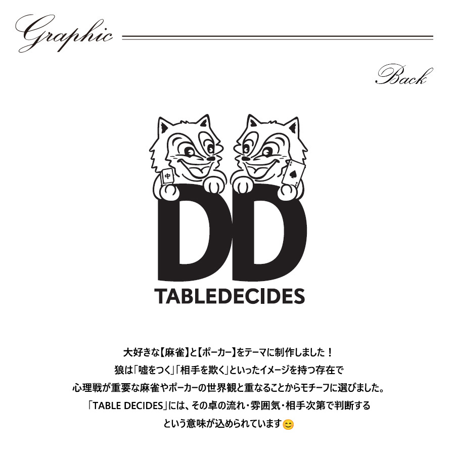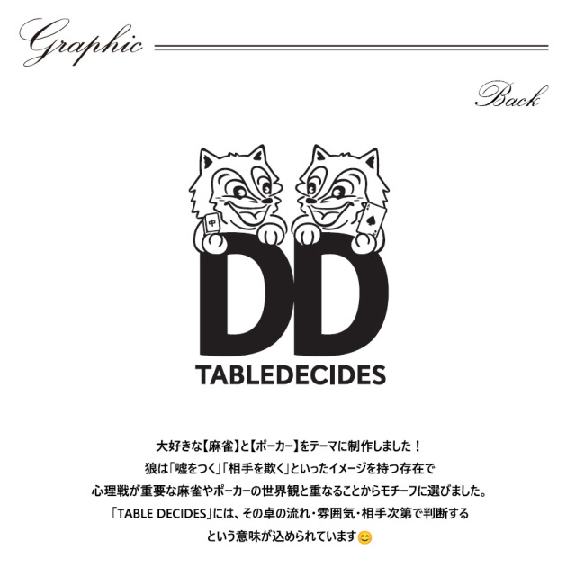 | 商品Data | ももさんとのコラボ企画! 今回のコラボは半袖Tシャツ、トレーナーをリリース。 【デザイン】 大好きな【麻雀】と【ポーカー】をテーマに制作しました! 狼は「嘘をつく」「相手を欺く」といったイメージを持つ存在で 心理戦が重要な麻雀やポーカーの世界観と重なることから モチーフに選びました。 「TABLE DECIDES」には、 その卓の流れ・雰囲気・相手次第で判断する という意味が込められています😊 ここでしか手に入らない受注期間限定アイテムです!是非お買い求めください!!! ※商品の発送予定時期は【4月下旬頃~5月上旬頃順次発送予定】 となります。 ※受注生産の為、発送予定時期が前後する場合がございます。 ※高額注文の場合には ご注文後にお電話にてご連絡をさせていただく場合がございます。 お電話にてご連絡が取れない場合にはメールにてご連絡させていただき、 ご連絡日より3日以内にご返信をいただけない場合には不正注文の可能性があると判断し トラブル防止のためご注文をキャンセルとさせていただきます。 ※商品によっては撮影時にサンプルを使用しているため若干仕様が異なる場合がございます。 また、サイズ・カラーによっては仕様が異なる場合もございます。 ※手作業で縫製をしているため縫製の仕様により、 個体差が生じてしまいますので、1~2cm程度の誤差は予めご了承くださいませ。 ※洗濯機を使用した場合、お届け時のサイズより多少縮む場合がございます。 洗濯機を使用する場合は裏返してネットに入れることを推奨しております。 また、タンブラー乾燥機を使用しますとプリントが剥がれる恐れがありますので 避けていただきますようお願いいたします。 また、洗濯時の液温は40度以下とし、 塩素系および酸素系漂白剤の使用は避けていただきますようお願いいたします。 アイロンにつきましてもプリント及び刺繍部分は避け、 生地部分にアイロンをかける場合にはあて布をして110度(低温)にてお願いいたします。 ※また、受注生産とさせていただいておりますが、 各色・サイズ毎に生産数に限りがございます為、 生産数の上限に達しました場合在庫切れとなる場合がございます。 |