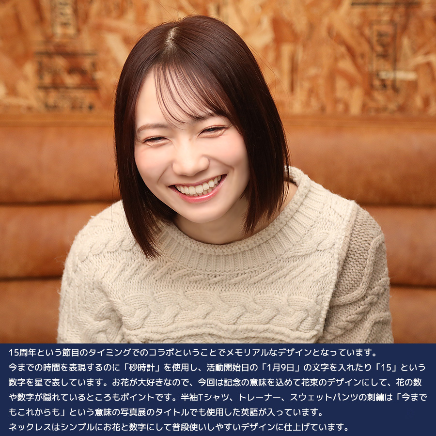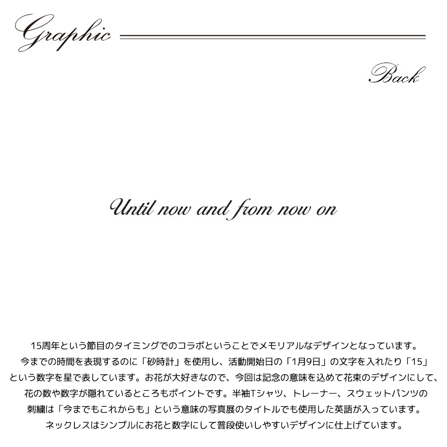 | 商品Data | 江嶋綾恵梨さんとのコラボ企画! 今回のコラボは半袖Tシャツ、スウェットパンツ、トレーナー、ネックレスをリリース。 【デザイン】 15周年という節目のタイミングでのコラボということでメモリアルなデザインとなっています。 今までの時間を表現するのに「砂時計」を使用し、活動開始日の「1月9日」の文字を入れたり「15」 という数字を星で表しています。お花が大好きなので、今回は記念の意味を込めて花束のデザインに して、花の数や数字が隠れているところもポイントです。半袖Tシャツ、トレーナー、スウェットパンツ の刺繍は「今までもこれからも」という意味の写真展のタイトルでも使用した英語が入っています。 ネックレスはシンプルにお花と数字にして普段使いしやすいデザインに仕上げています。 ここでしか手に入らない受注期間限定アイテムです!是非お買い求めください!!! ※商品の発送予定時期は【5月下旬頃~6月上旬頃順次発送】 となります。 ※受注生産の為、発送予定時期が前後する場合がございます。 ※高額注文の場合には ご注文後にお電話にてご連絡をさせていただく場合がございます。 お電話にてご連絡が取れない場合にはメールにてご連絡させていただき、 ご連絡日より3日以内にご返信をいただけない場合には不正注文の可能性があると判断し トラブル防止のためご注文をキャンセルとさせていただきます。 ※商品によっては撮影時にサンプルを使用しているため若干仕様が異なる場合がございます。 また、サイズ・カラーによっては仕様が異なる場合もございます。 ※手作業で縫製をしているため縫製の仕様により、 個体差が生じてしまいますので、1~2cm程度の誤差は予めご了承くださいませ。 ※洗濯機を使用した場合、お届け時のサイズより多少縮む場合がございます。 洗濯機を使用する場合は裏返してネットに入れることを推奨しております。 また、タンブラー乾燥機を使用しますとプリントが剥がれる恐れがありますので 避けていただきますようお願いいたします。 また、洗濯時の液温は40度以下とし、 塩素系および酸素系漂白剤の使用は避けていただきますようお願いいたします。 アイロンにつきましてもプリント及び刺繍部分は避け、 生地部分にアイロンをかける場合にはあて布をして110度(低温)にてお願いいたします。 ※また、受注生産とさせていただいておりますが、 各色・サイズ毎に生産数に限りがございます為、 生産数の上限に達しました場合在庫切れとなる場合がございます。 |