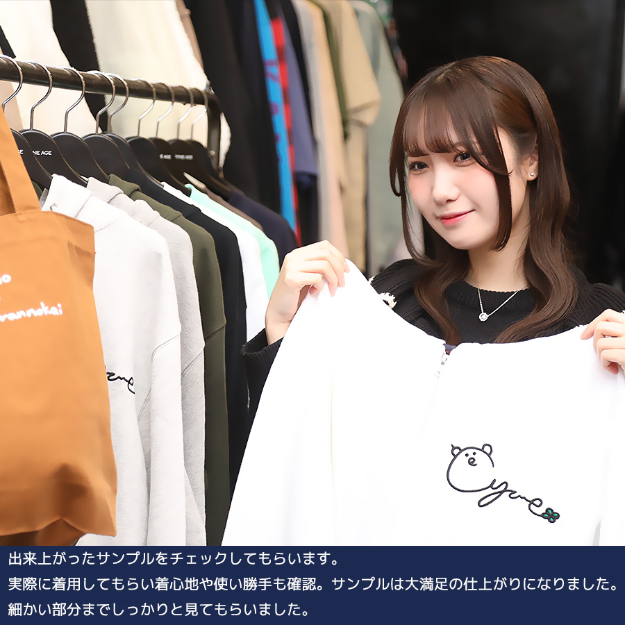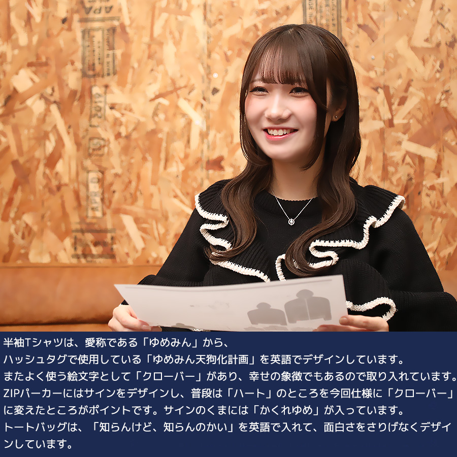 | 商品Data | 風宮ゆめさんとのコラボ企画! 今回のコラボは半袖Tシャツ、ZIPパーカー、トートバッグをリリース。 【デザイン】 半袖Tシャツは、愛称である「ゆめみん」から、ハッシュタグで使用している「ゆめみん天狗化計画」 を英語でデザインしています。 またよく使う絵文字として「クローバー」があり、幸せの象徴でもあるので取り入れています。 ZIPパーカーにはサインをデザインし、普段は「ハート」のところを今回仕様に「クローバー」に変えた ところがポイントです。 サインのくまには「かくれゆめ」が入っています。 トートバッグは、「知らんけど、知らんのかい」を英語で入れて、面白さをさりげなくデザインして います。 ここでしか手に入らない受注期間限定アイテムです!是非お買い求めください!!! ※商品の発送予定時期は 【4月下旬頃~5月上旬頃順次発送予定】 となります。 ※受注生産の為、発送予定時期が前後する場合がございます。 ※高額注文の場合にはご注文後にお電話にてご連絡をさせていただく場合がございます。 お電話にてご連絡が取れない場合にはメールにてご連絡させていただき、 ご連絡日より3日以内にご返信をいただけない場合には不正注文の可能性があると判断し トラブル防止のためご注文をキャンセルとさせていただきます。 ※商品によっては撮影時にサンプルを使用しているため若干仕様が異なる場合がございます。 また、サイズ・カラーによっては仕様が異なる場合もございます。 ※手作業で縫製をしているため縫製の仕様により、 個体差が生じてしまいますので、1~2cm程度の誤差は予めご了承くださいませ。 ※洗濯機を使用した場合、お届け時のサイズより多少縮む場合がございます。 洗濯機を使用する場合は裏返してネットに入れることを推奨しております。 また、タンブラー乾燥機を使用しますとプリントが剥がれる恐れがありますので 避けていただきますようお願いいたします。 また、洗濯時の液温は40度以下とし、 塩素系および酸素系漂白剤の使用は避けていただきますようお願いいたします。 アイロンにつきましてもプリント及び刺繍部分は避け、 生地部分にアイロンをかける場合にはあて布をして110度(低温)にてお願いいたします。 ※また、受注生産とさせていただいておりますが、 各色・サイズ毎に生産数に限りがございます為、 生産数の上限に達しました場合在庫切れとなる場合がございます。 |