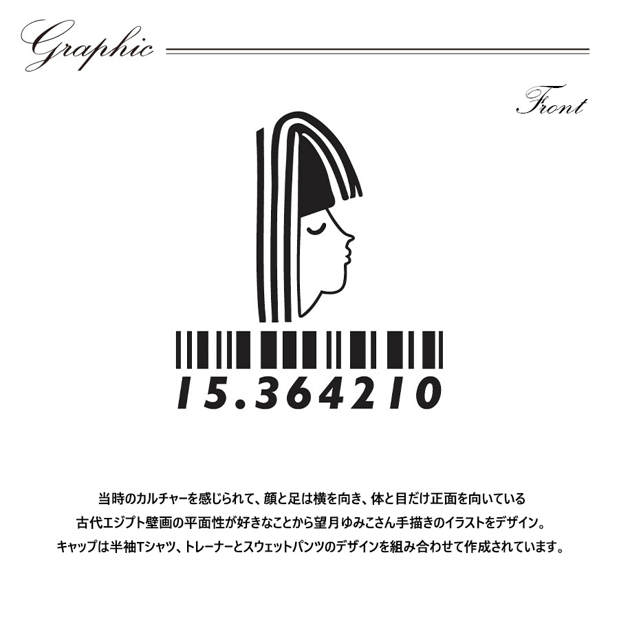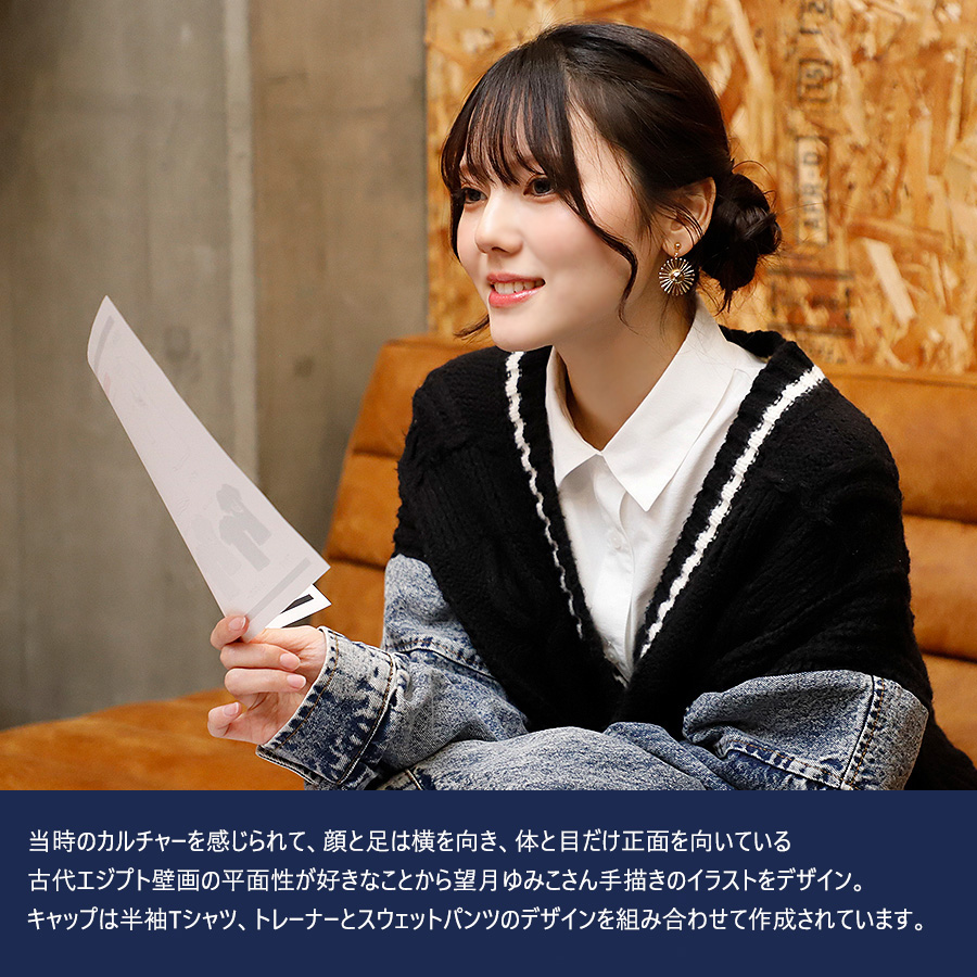 | 商品Data | 望月ゆみこさんとのコラボ企画! 今回のコラボは半袖Tシャツ、トレーナー、スウェットパンツ、キャップをリリース。 【デザイン】 当時のカルチャーを感じられて、顔と足は横を向き、 体と目だけ正面を向いている古代エジプト壁画の平面性が好きなことから キャップは半袖Tシャツ、トレーナーとスウェットパンツのデザインを 組み合わせて作成されています。 ここでしか手に入らない受注期間限定アイテムです!是非お買い求めください!!!
