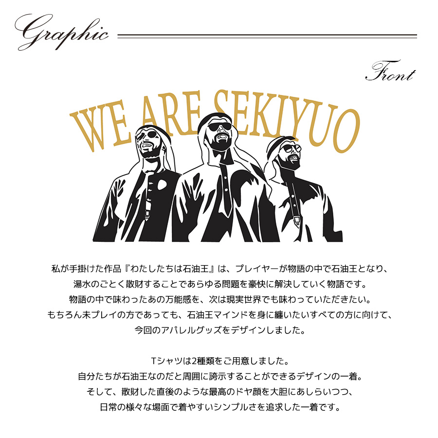 | 商品Data | 川犬さんとのコラボ企画! 今回のコラボは半袖TシャツTYPE-A、半袖TシャツTYPE-B、ネックレスをリリース。 【デザイン】 私が手掛けた作品『わたしたちは石油王』は、プレイヤーが物語の中で石油王となり、 湯水のごとく散財することであらゆる問題を豪快に解決していく物語です。 物語の中で味わったあの万能感を、次は現実世界でも味わっていただきたい。 もちろん未プレイの方であっても、石油王マインドを身に纏いたいすべての方に向けて、 今回のアパレルグッズをデザインしました。 Tシャツは2種類をご用意しました。 自分たちが石油王なのだと周囲に誇示することができるデザインの一着。 そして、散財した直後のような最高のドヤ顔を大胆にあしらいつつ、 日常の様々な場面で着やすいシンプルさを追求した一着です。 ここでしか手に入らない受注期間限定アイテムです!是非お買い求めください!!! ※商品の発送予定時期は【7月中旬頃~7月上旬頃順次発送予定】となります。 ※受注生産の為、発送予定時期が前後する場合がございます。 ※高額注文の場合には ご注文後にお電話にてご連絡をさせていただく場合がございます。 お電話にてご連絡が取れない場合にはメールにてご連絡させていただき、 ご連絡日より3日以内にご返信をいただけない場合には不正注文の可能性があると判断し トラブル防止のためご注文をキャンセルとさせていただきます。 ※商品によっては撮影時にサンプルを使用しているため若干仕様が異なる場合がございます。 また、サイズ・カラーによっては仕様が異なる場合もございます。 ※手作業で縫製をしているため縫製の仕様により、 個体差が生じてしまいますので、1~2cm程度の誤差は予めご了承くださいませ。 ※洗濯機を使用した場合、お届け時のサイズより多少縮む場合がございます。 洗濯機を使用する場合は裏返してネットに入れることを推奨しております。 また、タンブラー乾燥機を使用しますとプリントが剥がれる恐れがありますので 避けていただきますようお願いいたします。 また、洗濯時の液温は40度以下とし、 塩素系および酸素系漂白剤の使用は避けていただきますようお願いいたします。 アイロンにつきましてもプリント及び刺繍部分は避け、 生地部分にアイロンをかける場合にはあて布をして110度(低温)にてお願いいたします。 ※また、受注生産とさせていただいておりますが、 各色・サイズ毎に生産数に限りがございます為、 生産数の上限に達しました場合在庫切れとなる場合がございます。 |