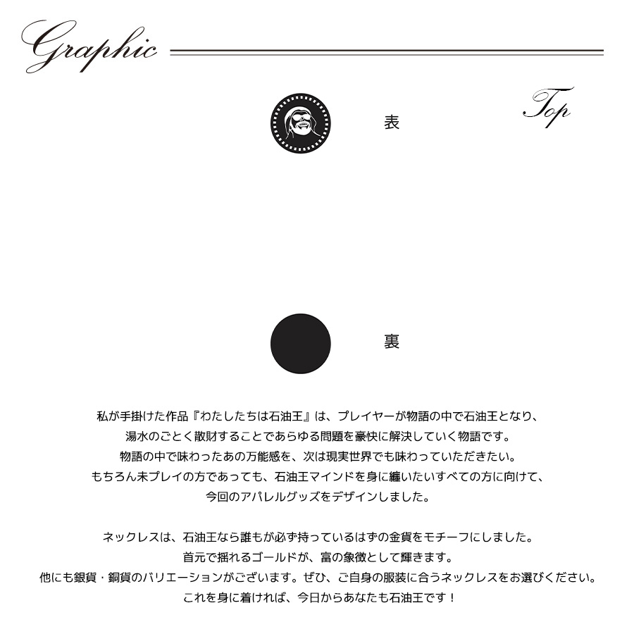 ※レディース・メンズモデル着用画像はコンポジットイメージとなります。 川犬さんとのコラボ企画! 今回のコラボは半袖TシャツTYPE-A、半袖TシャツTYPE-B、ネックレスをリリース。 【デザイン】 私が手掛けた作品『わたしたちは石油王』は、プレイヤーが物語の中で石油王となり、 湯水のごとく散財することであらゆる問題を豪快に解決していく物語です。 物語の中で味わったあの万能感を、次は現実世界でも味わっていただきたい。 もちろん未プレイの方であっても、石油王マインドを身に纏いたいすべての方に向けて、 今回のアパレルグッズをデザインしました。 ネックレスは、石油王なら誰もが必ず持っているはずの金貨をモチーフにしました。 首元で揺れるゴールドが、富の象徴として輝きます。 他にも銀貨・銅貨のバリエーションがございます。 ぜひ、ご自身の服装に合うネックレスをお選びください。 これを身に着ければ、今日からあなたも石油王です! ここでしか手に入らない受注期間限定アイテムです!是非お買い求めください!!! メッキ加工:国内加工 ※A.GOLD / A.SILVER の染料が他の衣類等に移る可能性があるのを防止する薬剤を塗布しております。 原型作成:国内 ※商品に付いているタグを取り外す際には破損の恐れがあるため必ずハサミを使用するようお願いします。 ※アレルギーの反応等がその時の体調や個人差により出る場合がございますので、 金属製アクセサリーを初めてご使用の場合は必ず「パッチテスト」をしてご使用ください。※ 【パッチテストとは】 金属アレルギーの場合、特殊なテープに24種類の金属試薬をつけてアレルギーの有無を調べる検査です。 皮膚科などで相談をすれば身近にできる検査です。 いくつか検査中に注意する点がありますのでテストを受ける病院で検査について相談してください。 ※現時点での商品の発送予定時期は【7月中旬頃~7月上旬頃順次発送予定】 となります。 ※受注生産の為、発送予定時期が前後する場合がございます。 ※高額注文の場合には ご注文後にお電話にてご連絡をさせていただく場合がございます。 お電話にてご連絡が取れない場合にはメールにてご連絡させていただき、 ご連絡日より3日以内にご返信をいただけない場合には不正注文の可能性があると判断し トラブル防止のためご注文をキャンセルとさせていただきます。 また、受注生産とさせていただいておりますが、 各色・サイズ毎に生産数を設けさせて頂いております為、 生産数の上限に達しました場合在庫切れとなる場合がございます。 ※※商品画像は照明などの影響により実際の色と異なる場合がございます ※加工の特性上、仕上がり寸法及び色のニュアンスが多少異なることがあります。 |