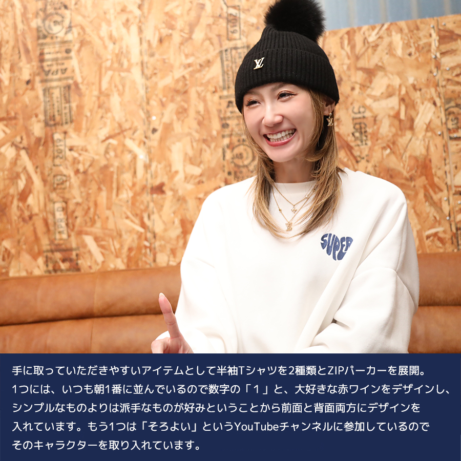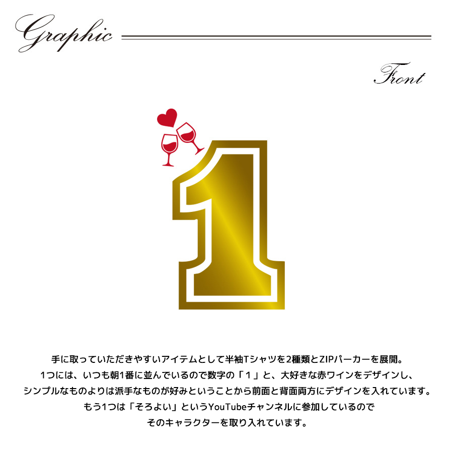 | 商品Data | Emimiさんとのコラボ企画! 今回のコラボは半袖TシャツTYPE-A、半袖TシャツTYPE-B、ZIPパーカーをリリース。 【デザイン】 手に取っていただきやすいアイテムとして半袖Tシャツを2種類とZIPパーカーを展開。 1つには、いつも朝1番に並んでいるので数字の「1」と、大好きな赤ワインをデザインし、 シンプルなものよりは派手なものが好みということから前面と背面両方にデザインを入れています。 もう1つは「そろよい」というYouTubeチャンネルに参加しているのでそのキャラクターを取り入れています。 ここでしか手に入らない受注期間限定アイテムです!是非お買い求めください!!! ※商品の発送予定時期は【5月下旬頃~6月上旬頃順次発送】 となります。 ※受注生産の為、発送予定時期が前後する場合がございます。 ※高額注文の場合には ご注文後にお電話にてご連絡をさせていただく場合がございます。 お電話にてご連絡が取れない場合にはメールにてご連絡させていただき、 ご連絡日より3日以内にご返信をいただけない場合には不正注文の可能性があると判断し トラブル防止のためご注文をキャンセルとさせていただきます。 ※商品によっては撮影時にサンプルを使用しているため若干仕様が異なる場合がございます。 また、サイズ・カラーによっては仕様が異なる場合もございます。 ※手作業で縫製をしているため縫製の仕様により、 個体差が生じてしまいますので、1~2cm程度の誤差は予めご了承くださいませ。 ※洗濯機を使用した場合、お届け時のサイズより多少縮む場合がございます。 洗濯機を使用する場合は裏返してネットに入れることを推奨しております。 また、タンブラー乾燥機を使用しますとプリントが剥がれる恐れがありますので 避けていただきますようお願いいたします。 また、洗濯時の液温は40度以下とし、 塩素系および酸素系漂白剤の使用は避けていただきますようお願いいたします。 アイロンにつきましてもプリント及び刺繍部分は避け、 生地部分にアイロンをかける場合にはあて布をして110度(低温)にてお願いいたします。 ※また、受注生産とさせていただいておりますが、 各色・サイズ毎に生産数に限りがございます為、 生産数の上限に達しました場合在庫切れとなる場合がございます。 |
